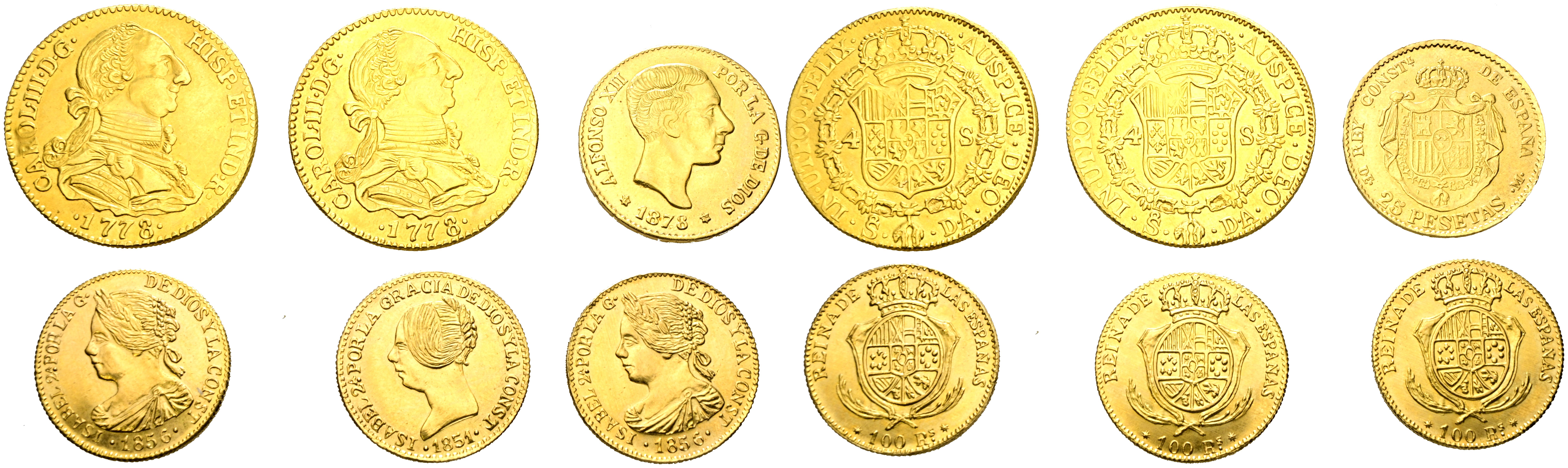 English SPANISH MONAGoodHY. Set of 6 gold jewelry replicas of different modules and kings. Total weight of the set 56.36g. Gold purity: 0.700 thousandths. Excellent condition. TO BE EXAMINED.