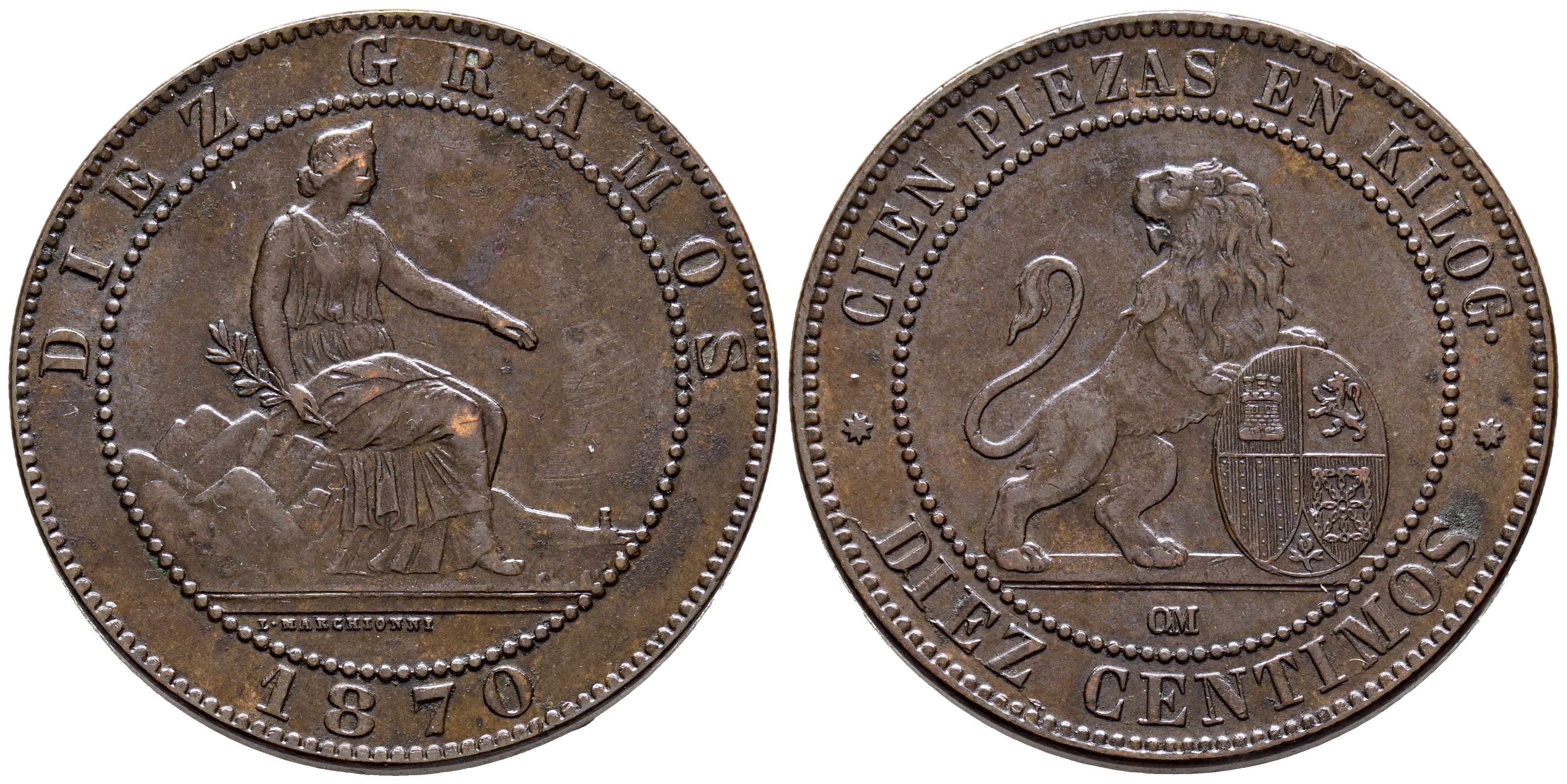 PROVISIONAL GOVERNMENT (1868-1871). 10 Cents. (Ae. 9,80g/30mm). 1870. Barcelona. (Cal-2019-8). VF+.