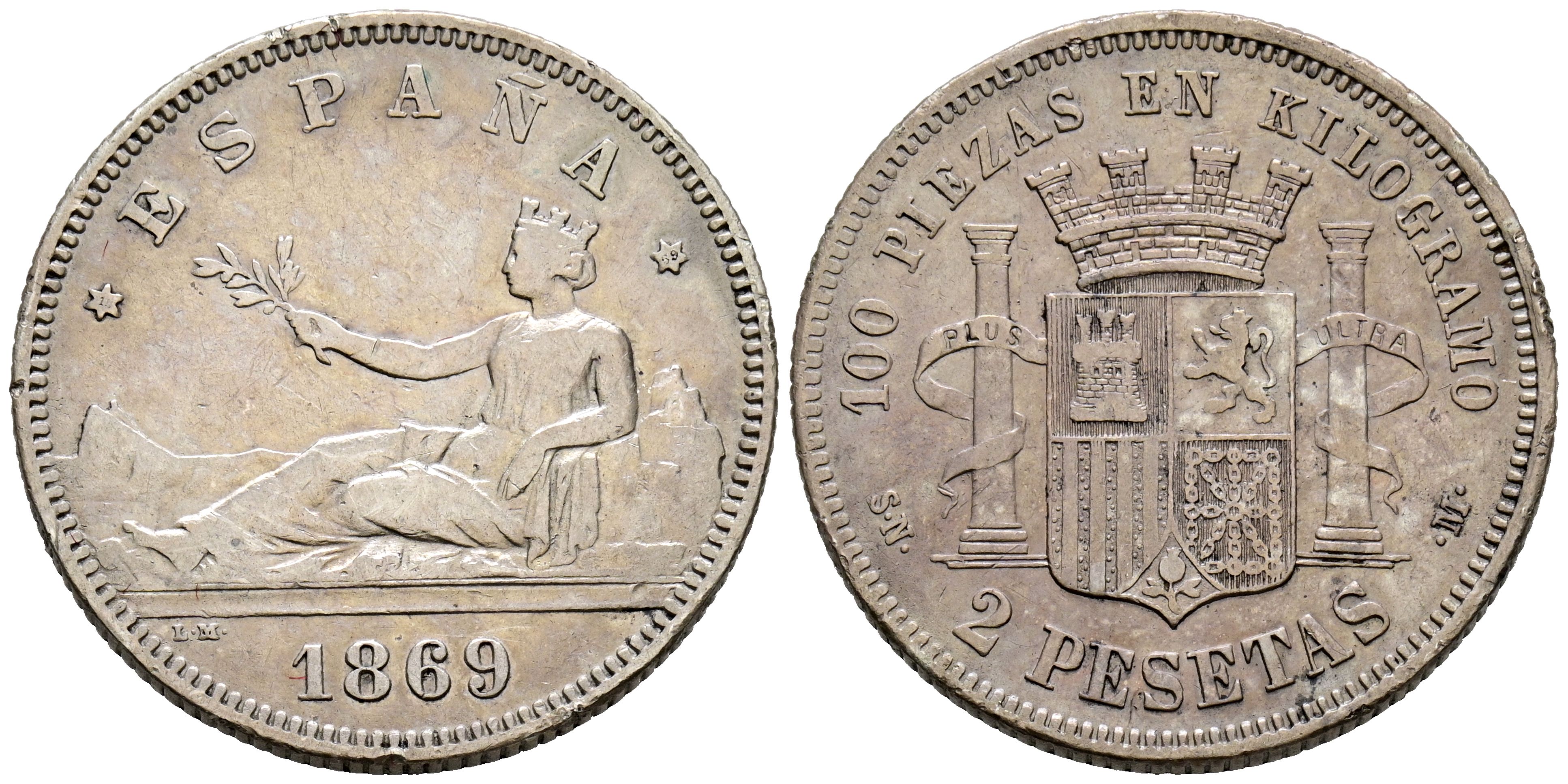 PROVISIONAL GOVERNMENT (1868-1871). 2 Pesetas. (Ar. 9,81g/27mm). 1869 *18-69. Madrid SNM. (Cal-2019-22). VF. Light iridescent tone.