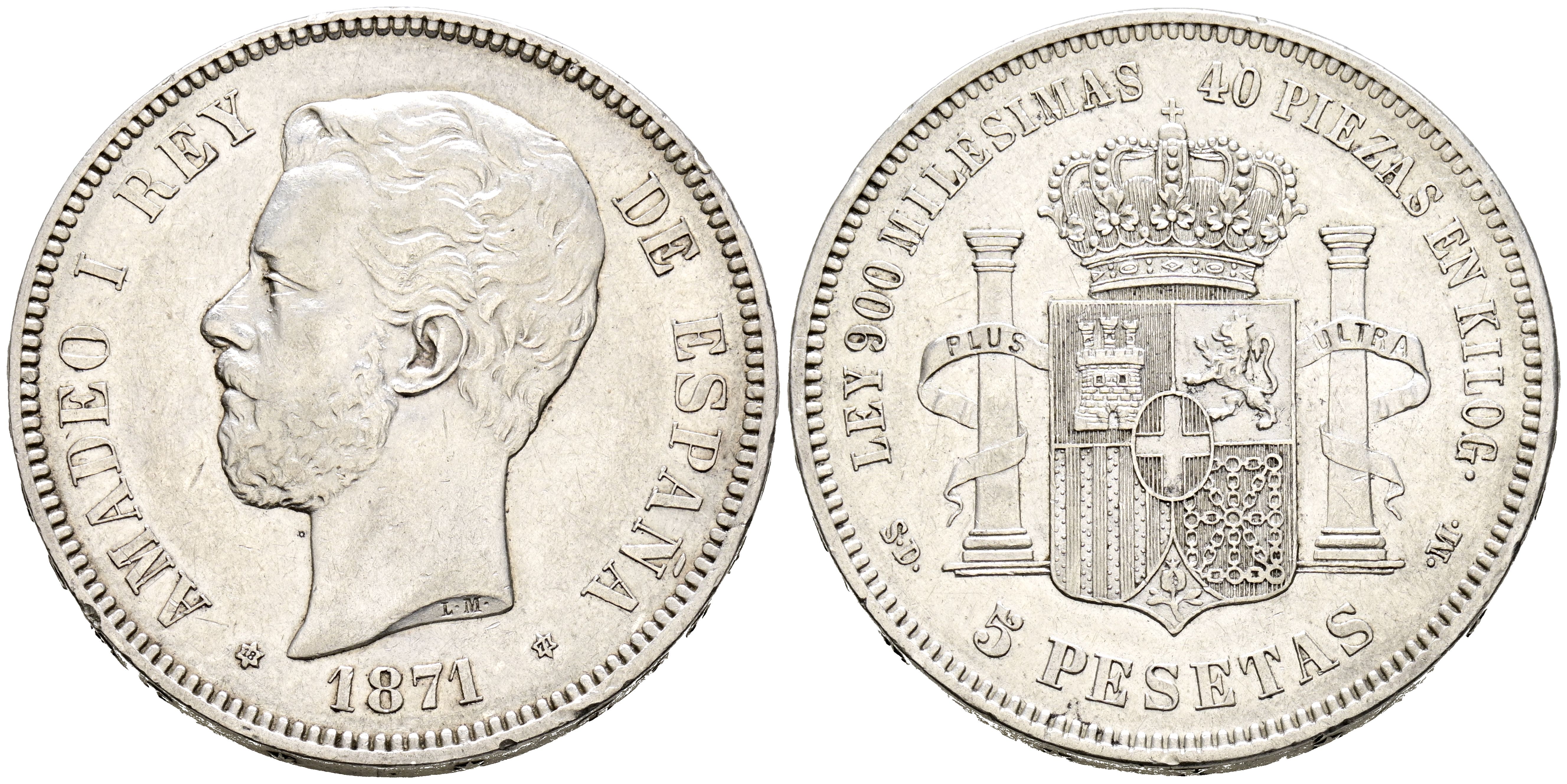 AMADEO I (1871-1873). 5 Pesetas. (Ar. 24,88g/37mm). 1871 *18-71. Madrid SDM. (Cal-2019-1). Good Very Fine. Remains of original shine.