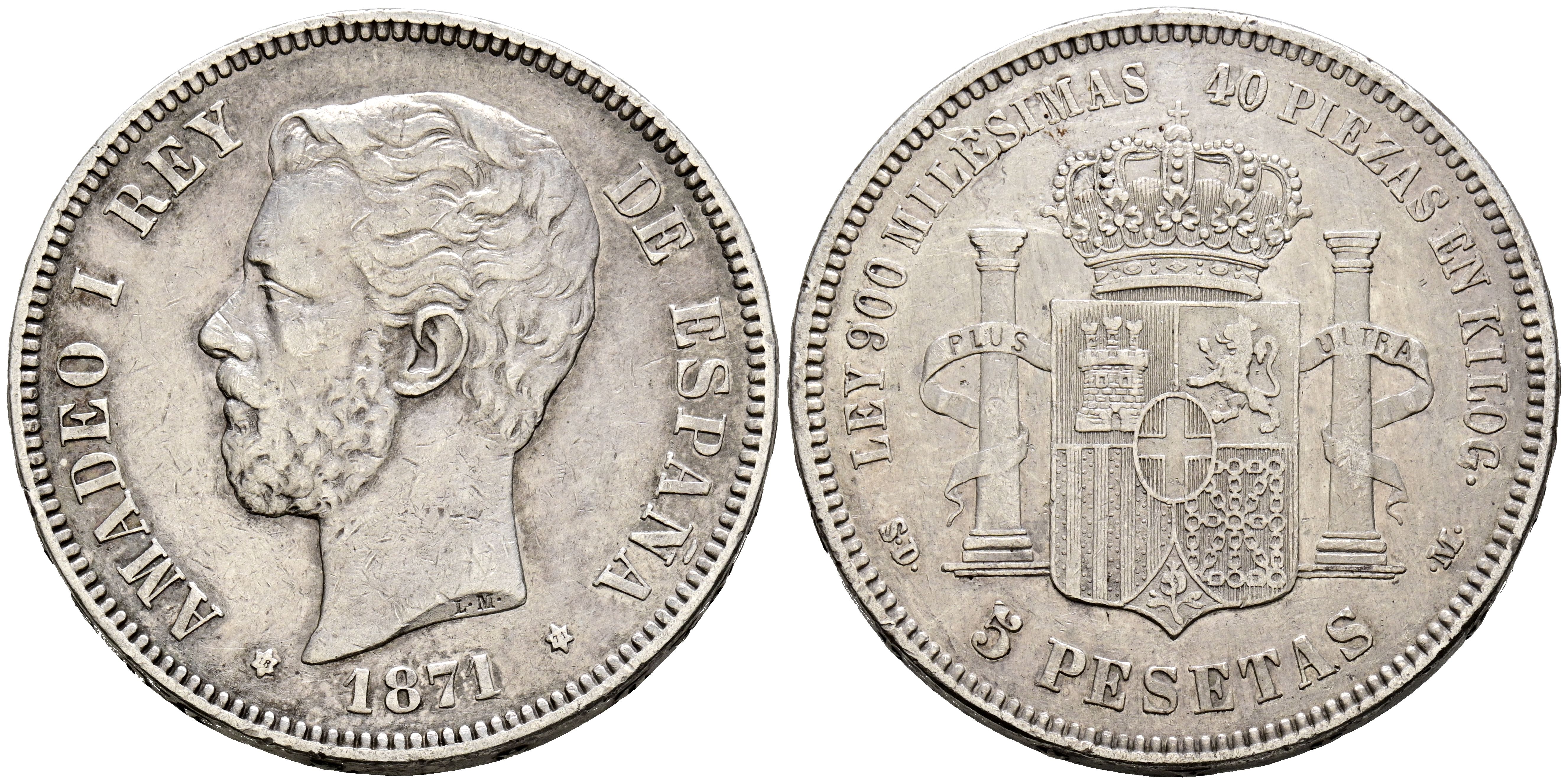 English AMADEO I (1871-1873). 5 Pesetas. (Ar. 24.92g/37mm). 1871 *18-71. Madrid SDM. (Cal-2019-1). Very Fine.