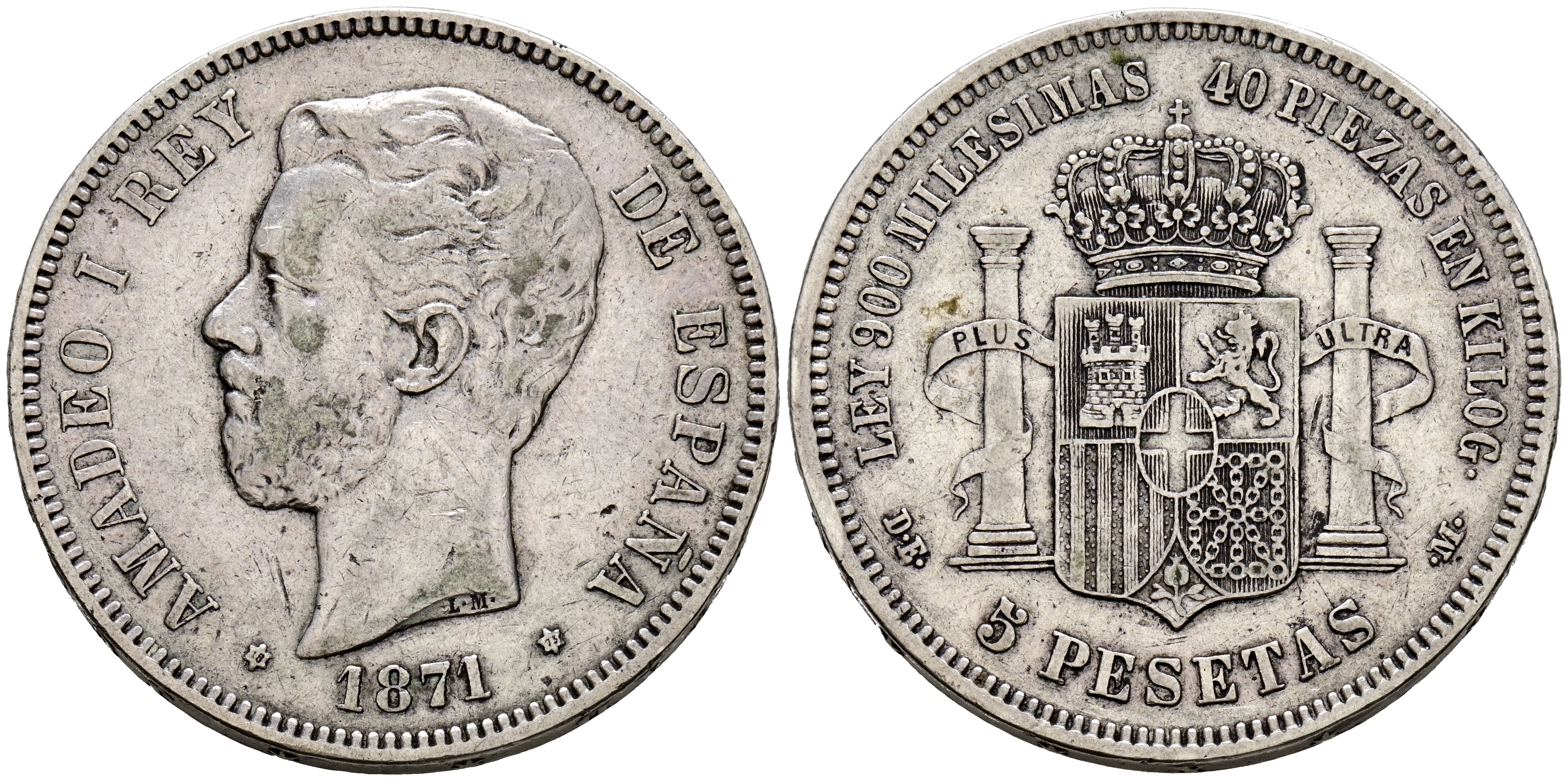 English AMADEO I (1871-1873). 5 Pesetas. (Ar. 24,87g/37mm). 1871 *18-73. Madrid DEM. (Cal-2019-3). VF-. Scarce.