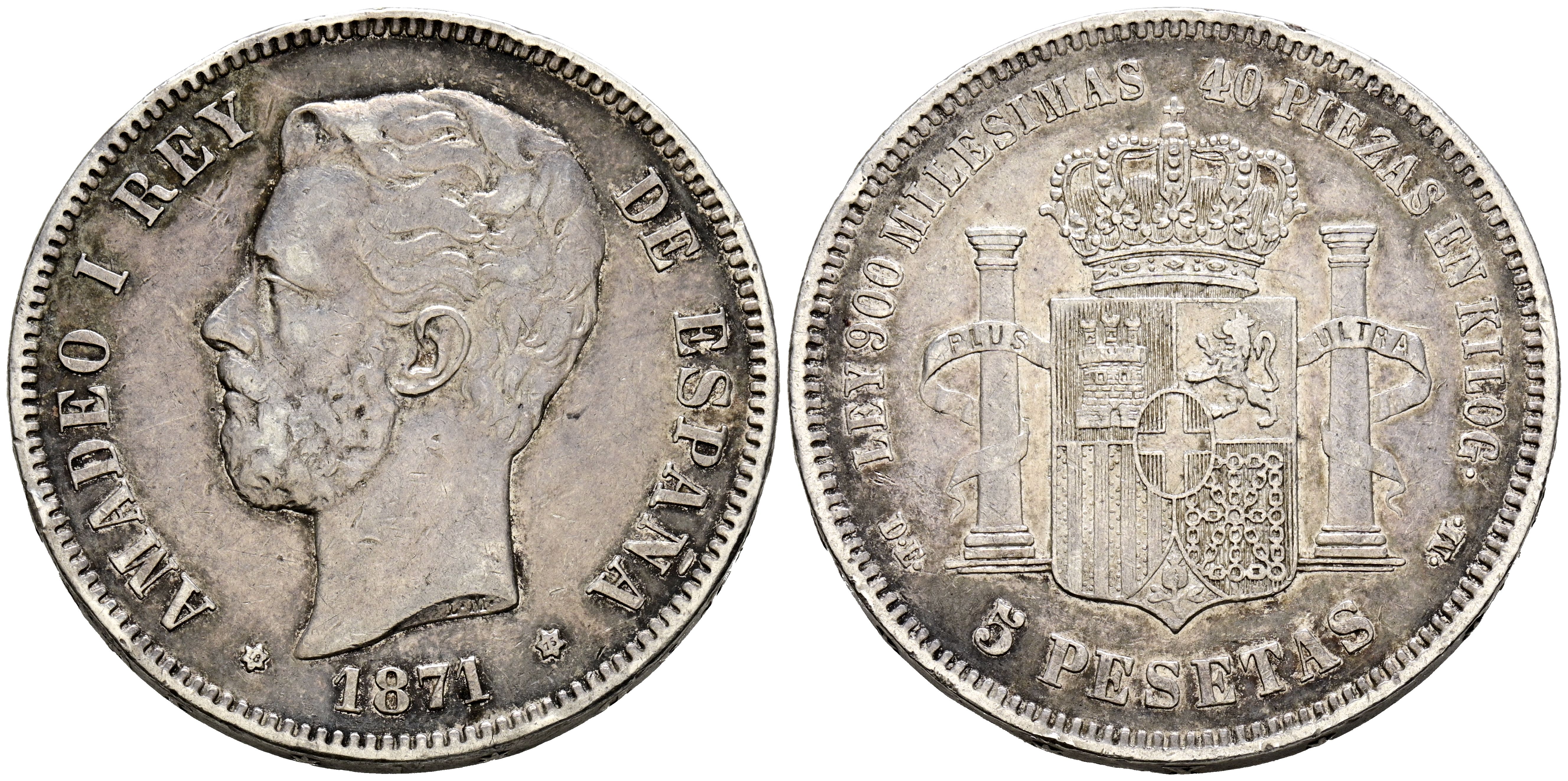 AMADEO I (1871-1873). 5 Pesetas. (Ar. 24,84g/37mm). 1871 *18-75. Madrid DEM. (Cal-2019-7). Minted during the reign of Alfonso XII. VF.