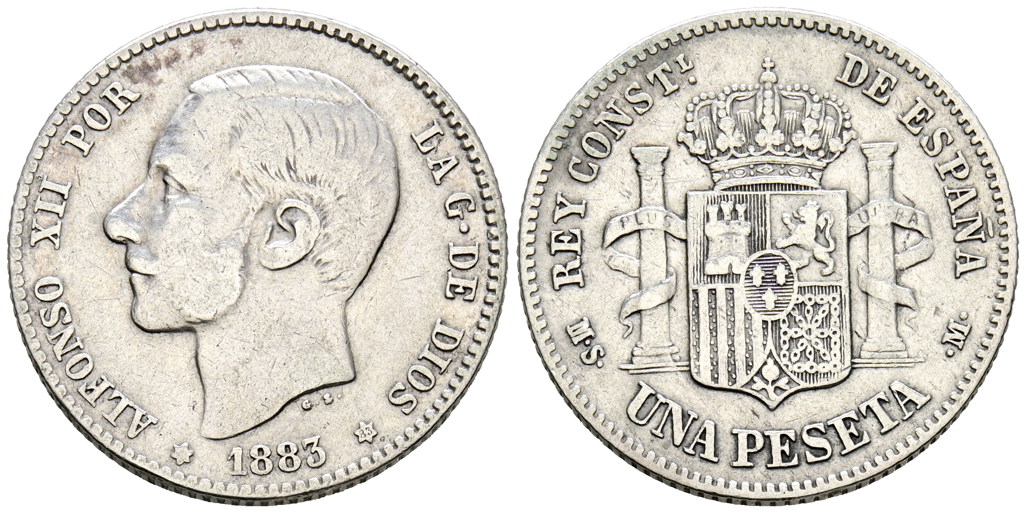 English ALFONSO XII (1874-1885). 1 Peseta. (Ar. 4,88/23mm). 1883 *18-83. Madrid MSM. (Cal-2019-21). Very Fine. First star not visible. Scarce.