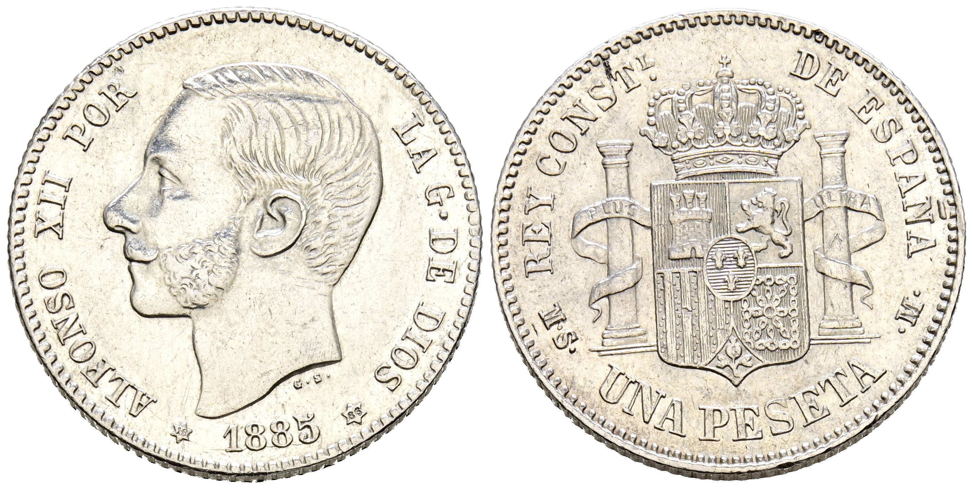 English ALFONSO XII. (1874-1885). 1 Peseta (Ar. 5,00g/23mm). 1885 *18-86. Madrid MSM. (Cal-2019-24). Good Very Fine. Minted during the reign of Alfonso XIII. Cleaned. Scarce as is.
