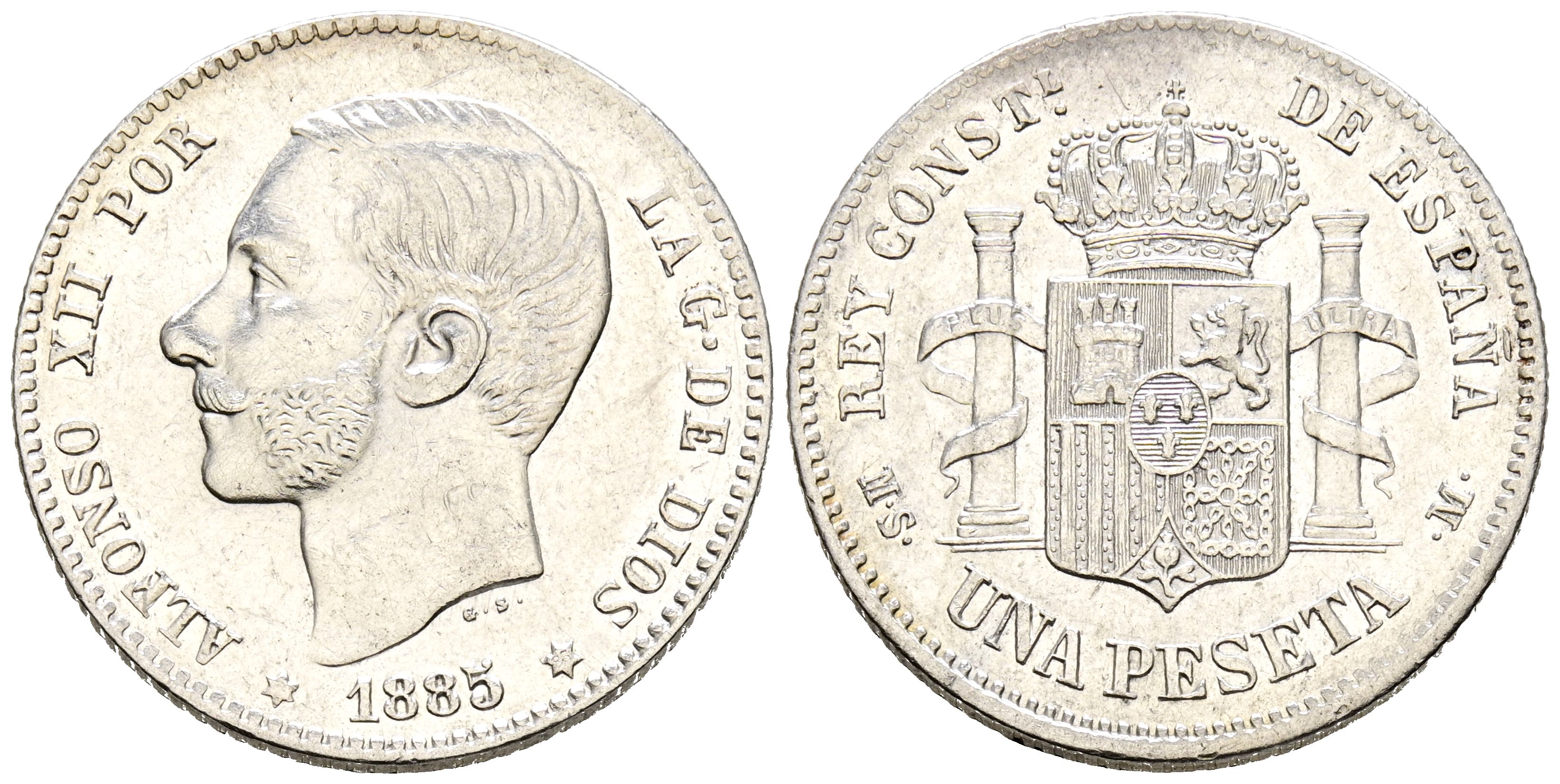 English ALFONSO XII. (1874-1885). 1 Peseta (Ar. 4.97g/23mm). 1885 *18-85. Madrid MSM. (Cal-2019-24). Good Very Fine. First star not visible. Cleaned. Rare as is.
