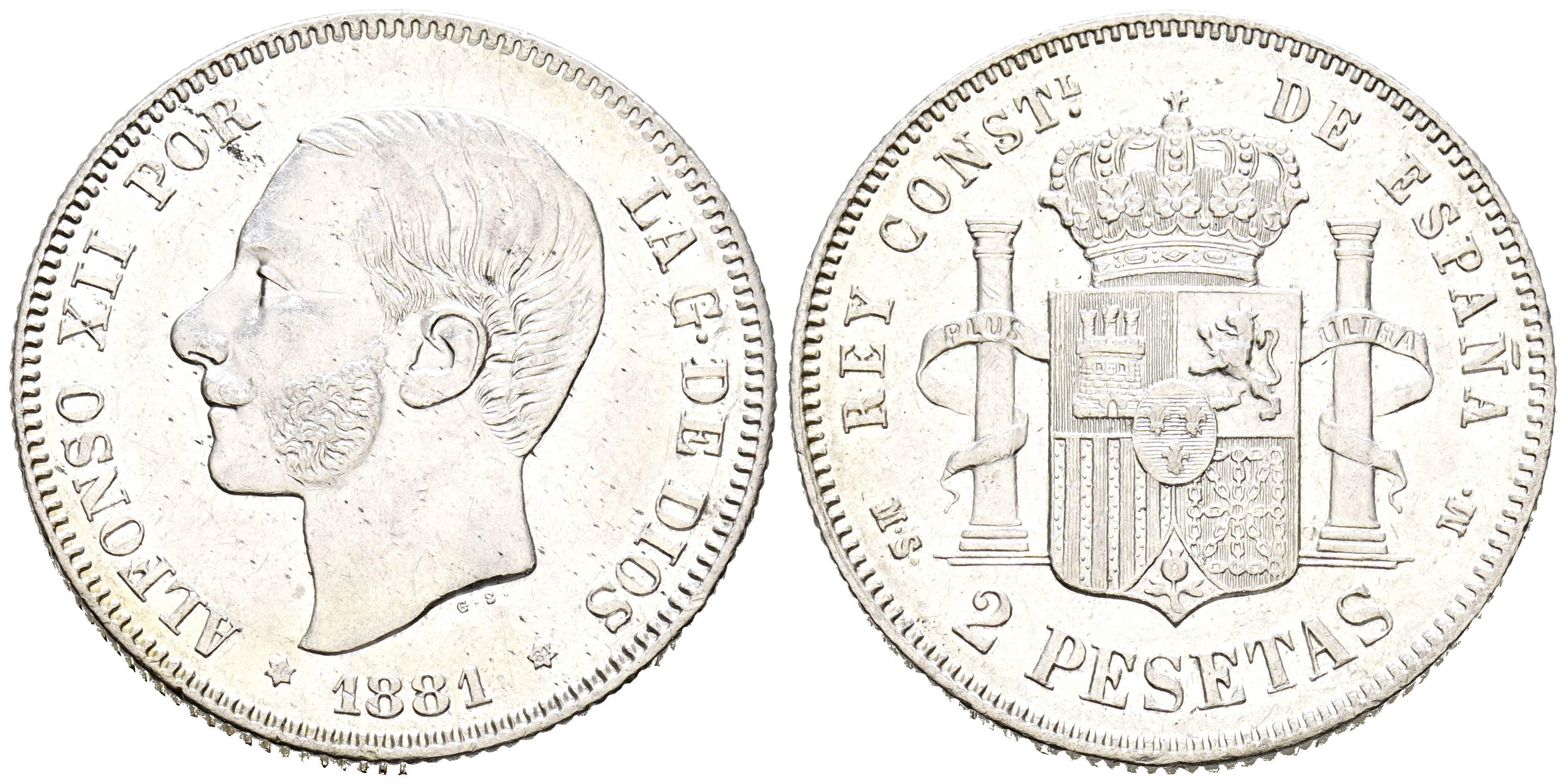 English ALFONSO XII (1874-1885). 2 Pesetas. (Ar. 9,99g/27mm). 1881 *18-81. Madrid MSM. (Cal-2019-28). Good Very Fine. Cleaned. Remains of original shine.