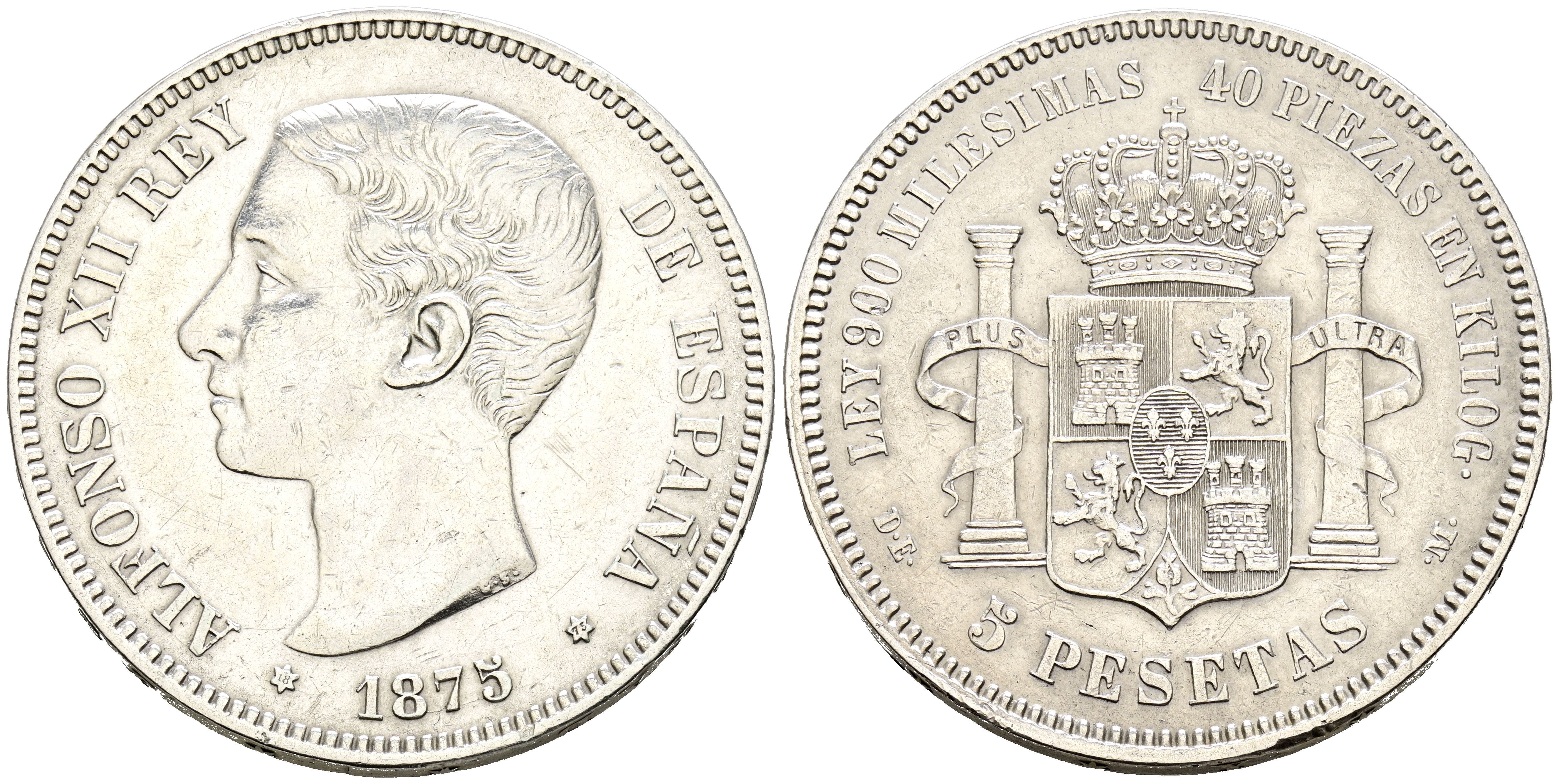 ALFONSO XII (1874-1885). 5 Pesetas. (Ar. 24,79g/37mm). 1875 *18-75. Madrid DEM. (Cal-2019-35). Good Very Fine. Cleaned.