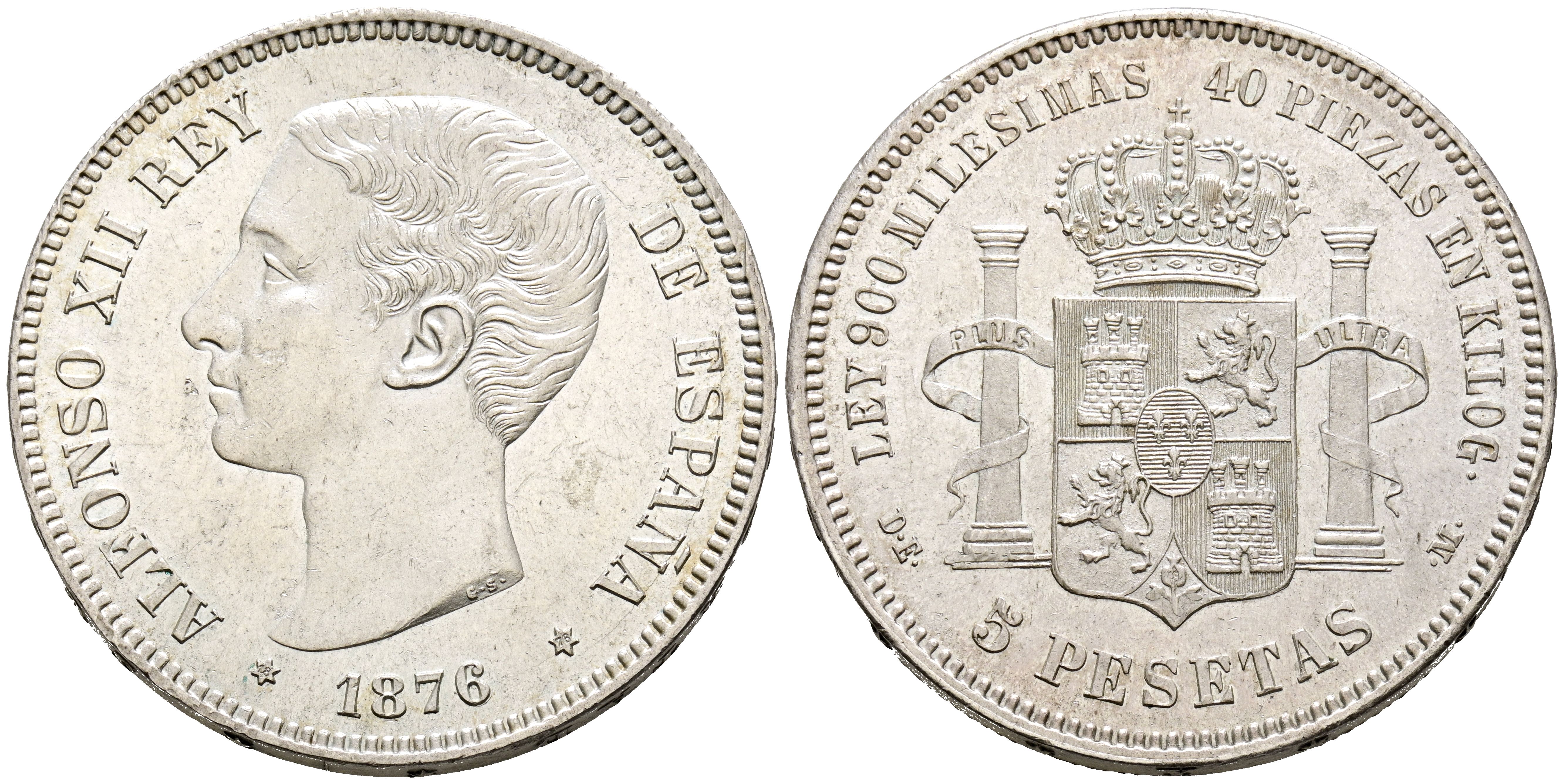 English ALFONSO XII (1874-1885). 5 Pesetas. (Ar. 25,17g/37mm). 1876 *18-76. Madrid DEM. (Cal-2019-37). Good Extremely Fine. Light marks on obverse. Original shine. Excellent specimen.