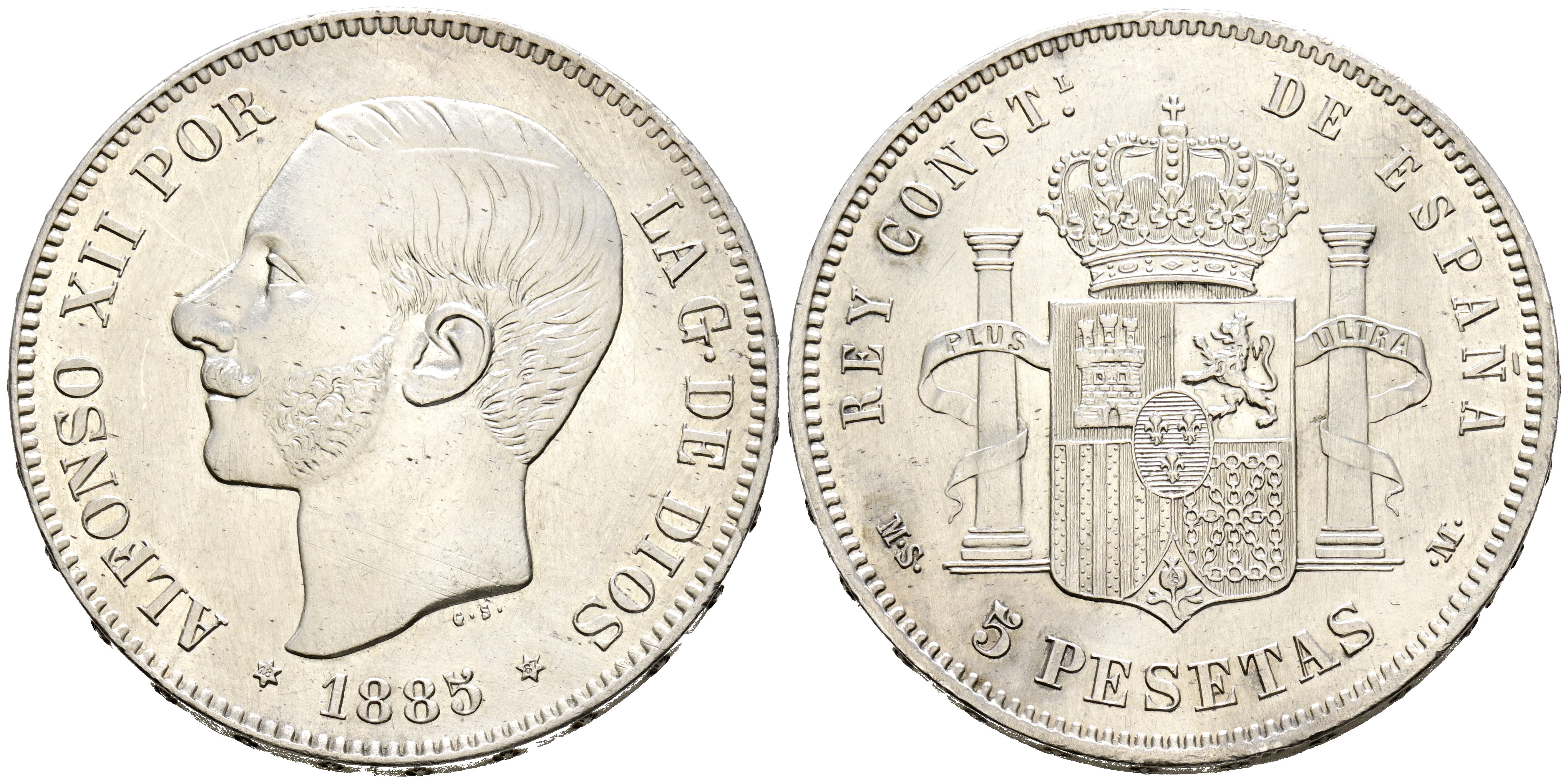 English ALFONSO XII (1874-1885). 5 Pesetas. (Ar. 25,01g/38mm). 1885 *18-87. Madrid MSM. (Cal-2019-62). Minted during the reign of Alfonso XIII. Extremely Fine. Cleaning lines.