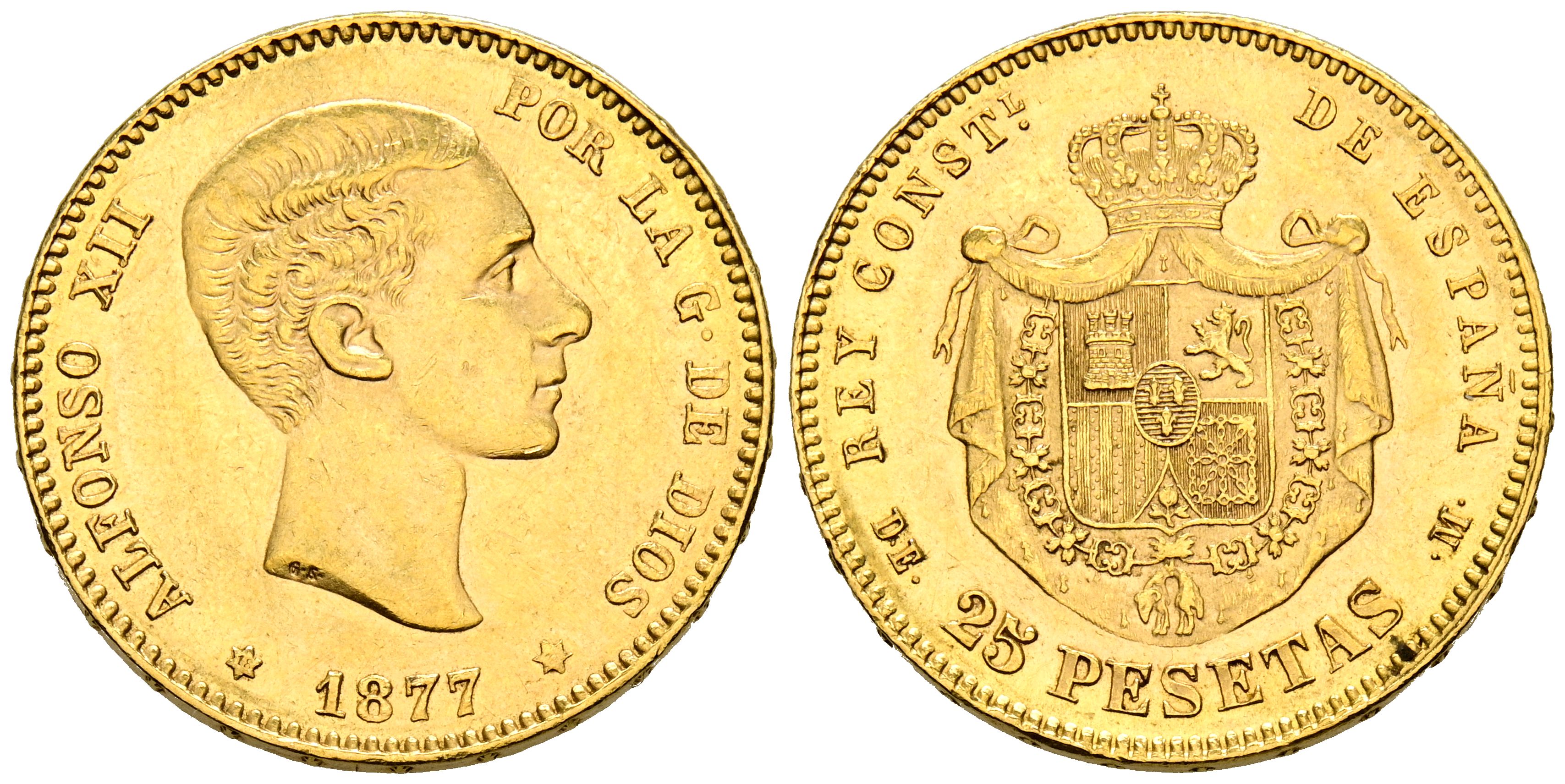 ALFONSO XII (1874-1885). 25 Pesetas. (Au. 8,05g/24mm). 1877 *18-77. Madrid DEM. (Cal-2019-68). Extremely Fine-. Second star not visible.