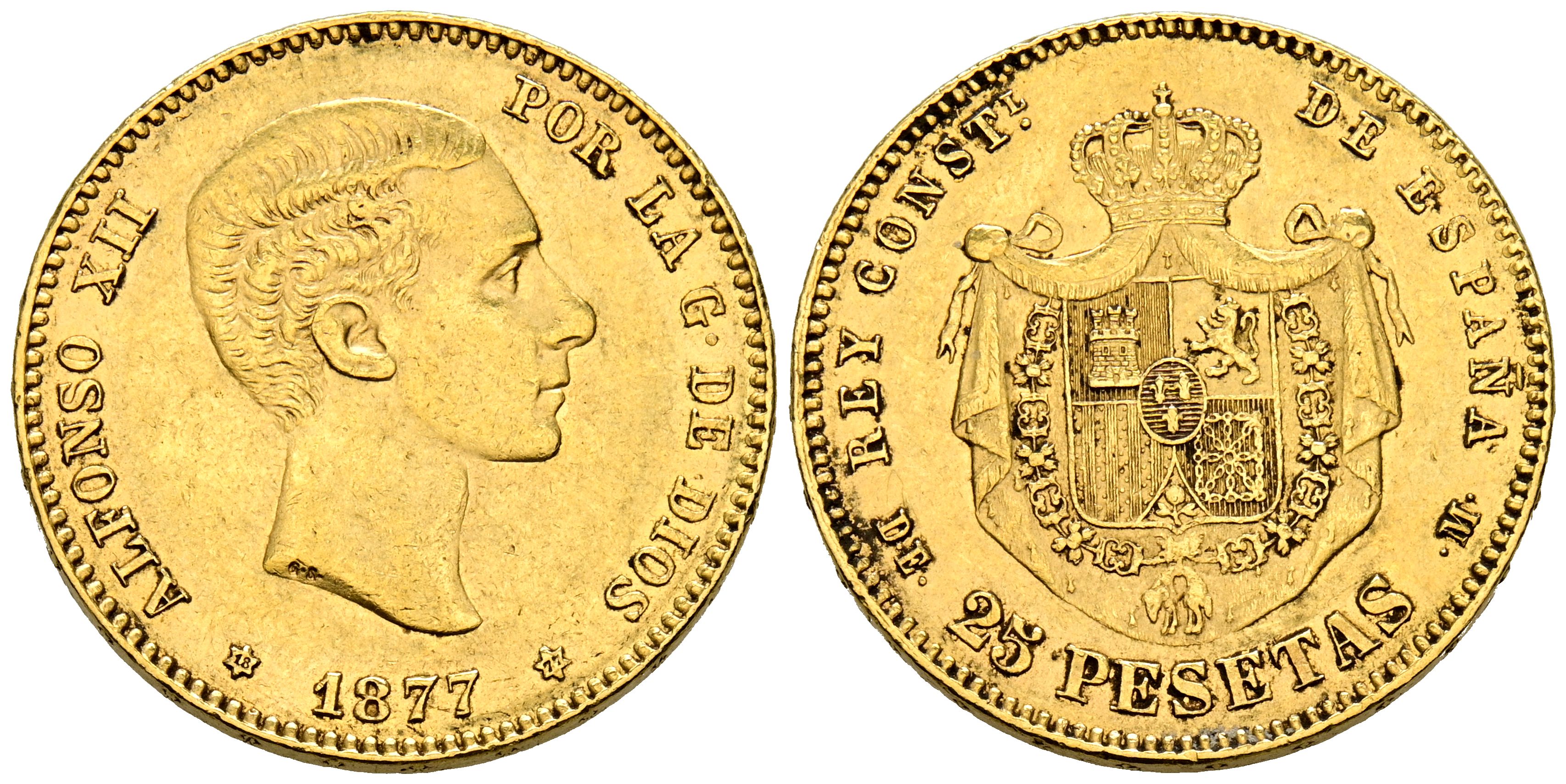 English ALFONSO XII (1874-1885). 25 Pesetas. (Au. 8.05g/24mm). 1877 *18-77. Madrid DEM. (Cal-2019-68). Good Very Fine.