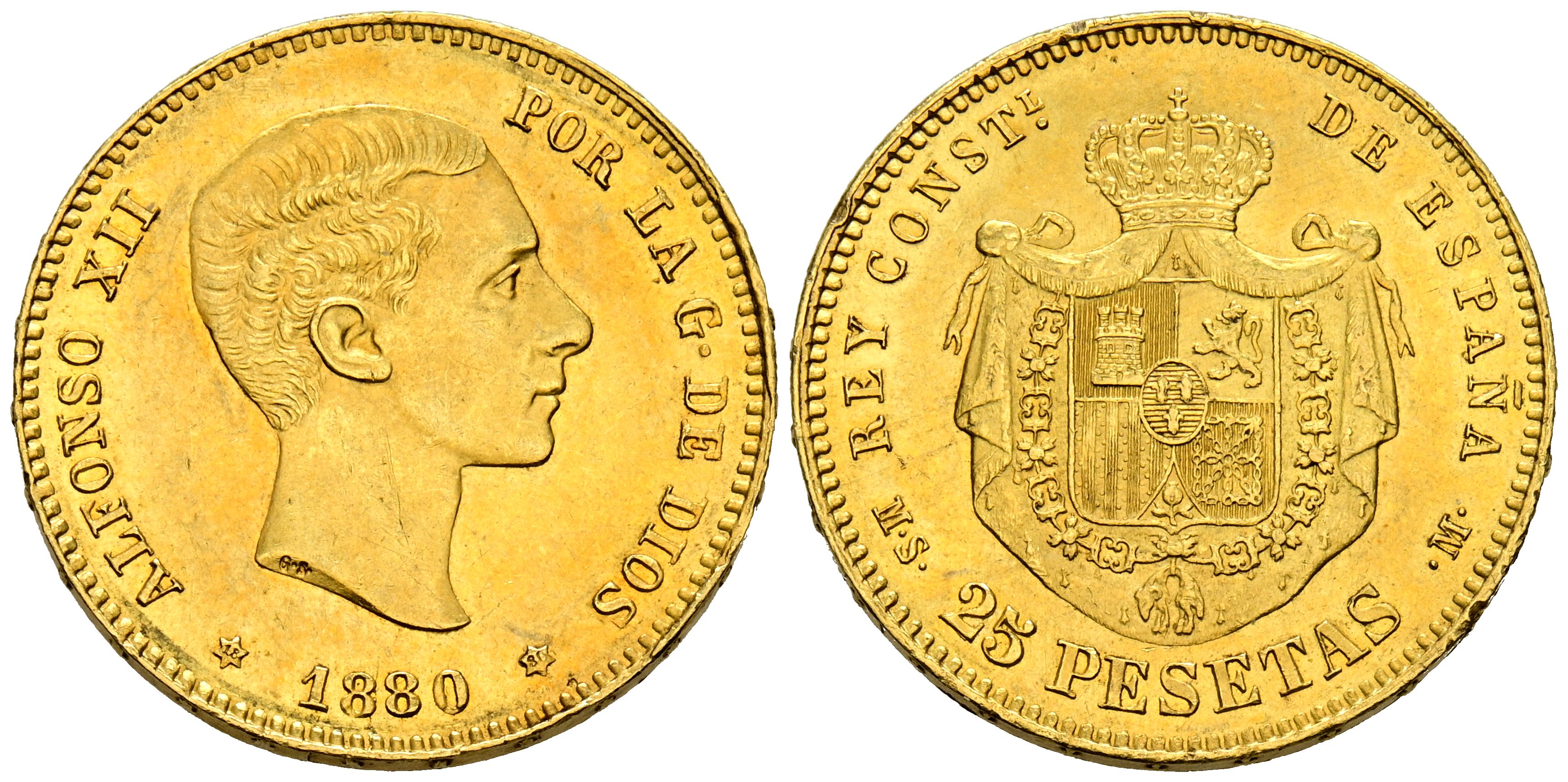 ALFONSO XII (1874-1885). 25 Pesetas. (Au. 8.06g/24mm). 1880 *18-80. Madrid MSM. (Cal-2019-79). Good Very Fine.