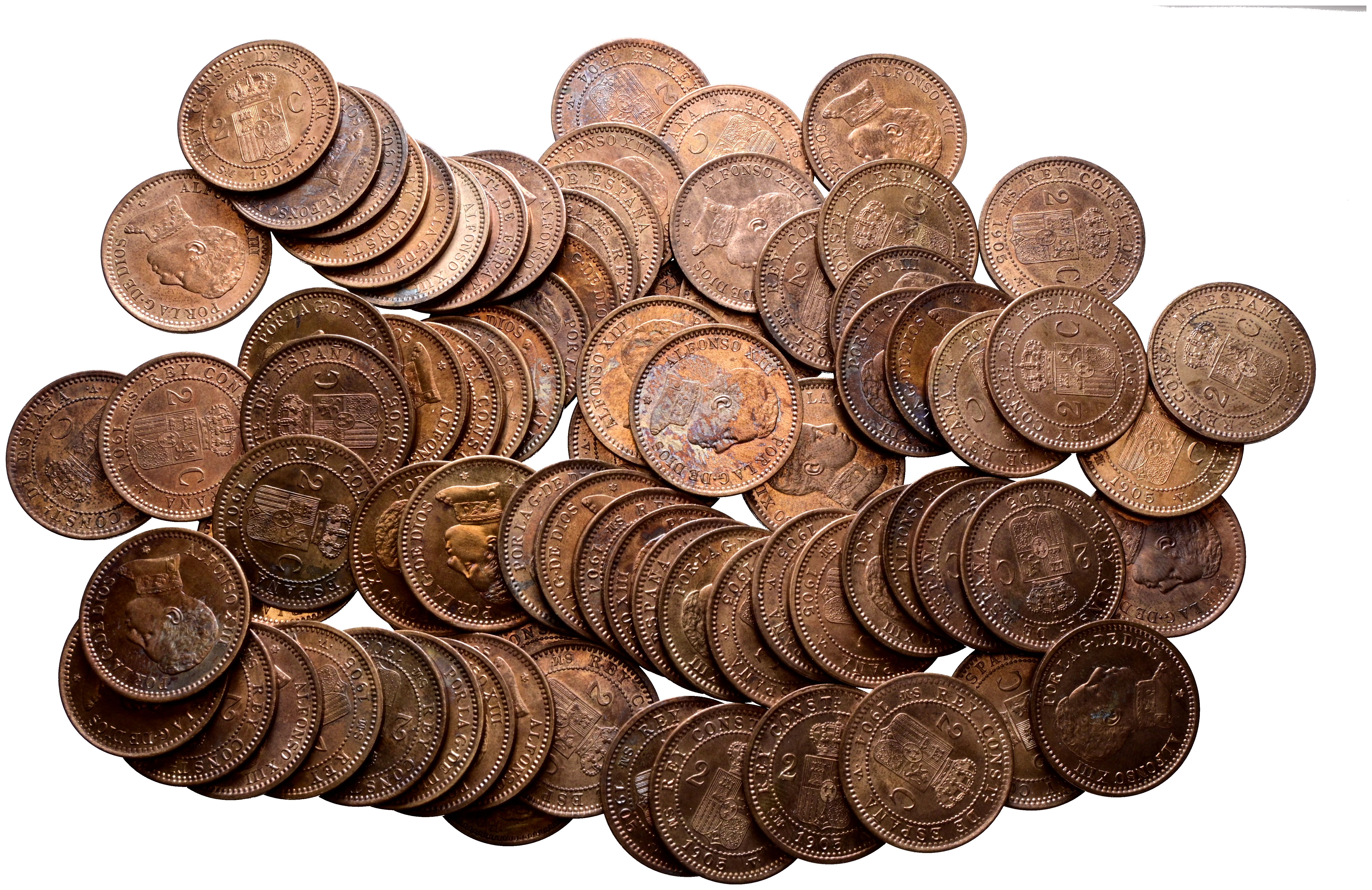 English ALFONSO XIII (1885-1931). Excellent set consisting of more than 70 copper pieces of 2 Cents minted in 1904 and 1905. Includes some examples of the 1904 zero match variant. Excellent general state of conservation. Beautiful patinas. WORTH EXAMINING.
