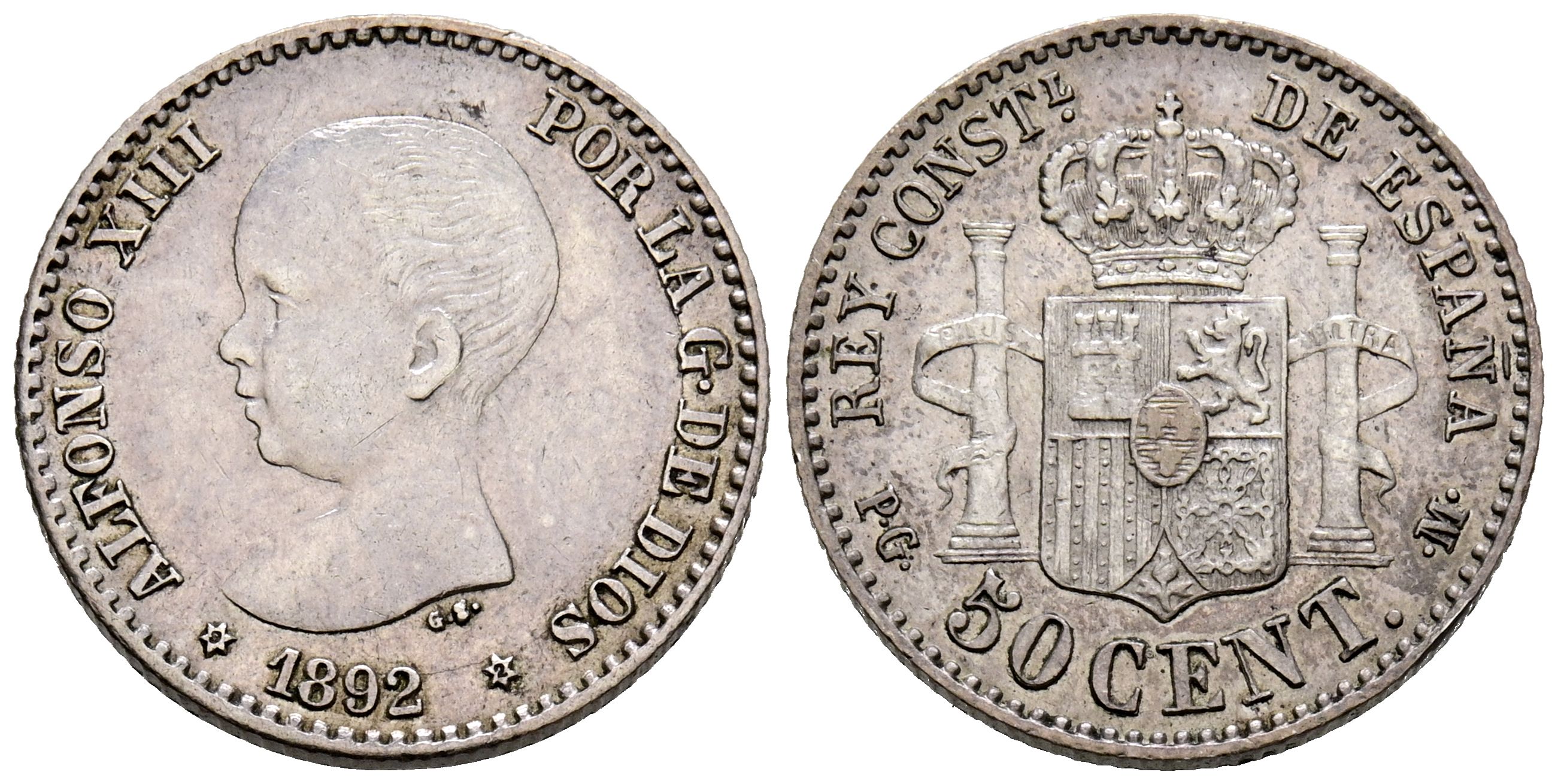 English ALFONSO XIII (1885-1931). 50 Cents. (Ar. 2.51g/18mm). 1892 *9-2. Madrid PGM. (Cal-2019-38). Extremely Fine-.