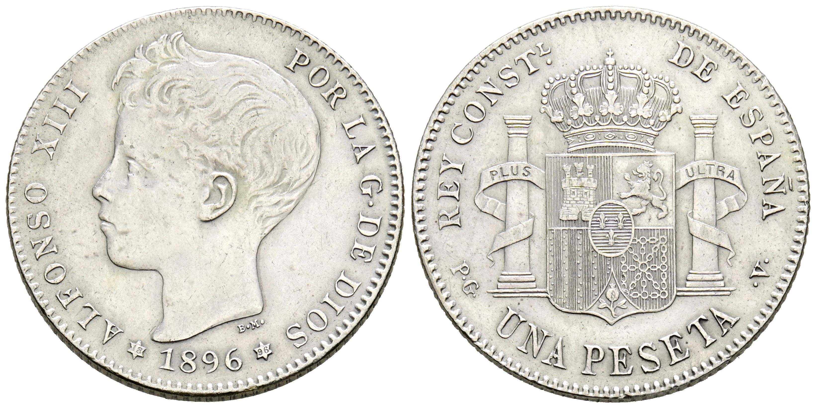ALFONSO XIII (1885-1931). 1 Peseta. (Ar. 4.96g/23mm). 1896 *18-96. Madrid PGV. (Cal-2019-56). Extremely Fine-.