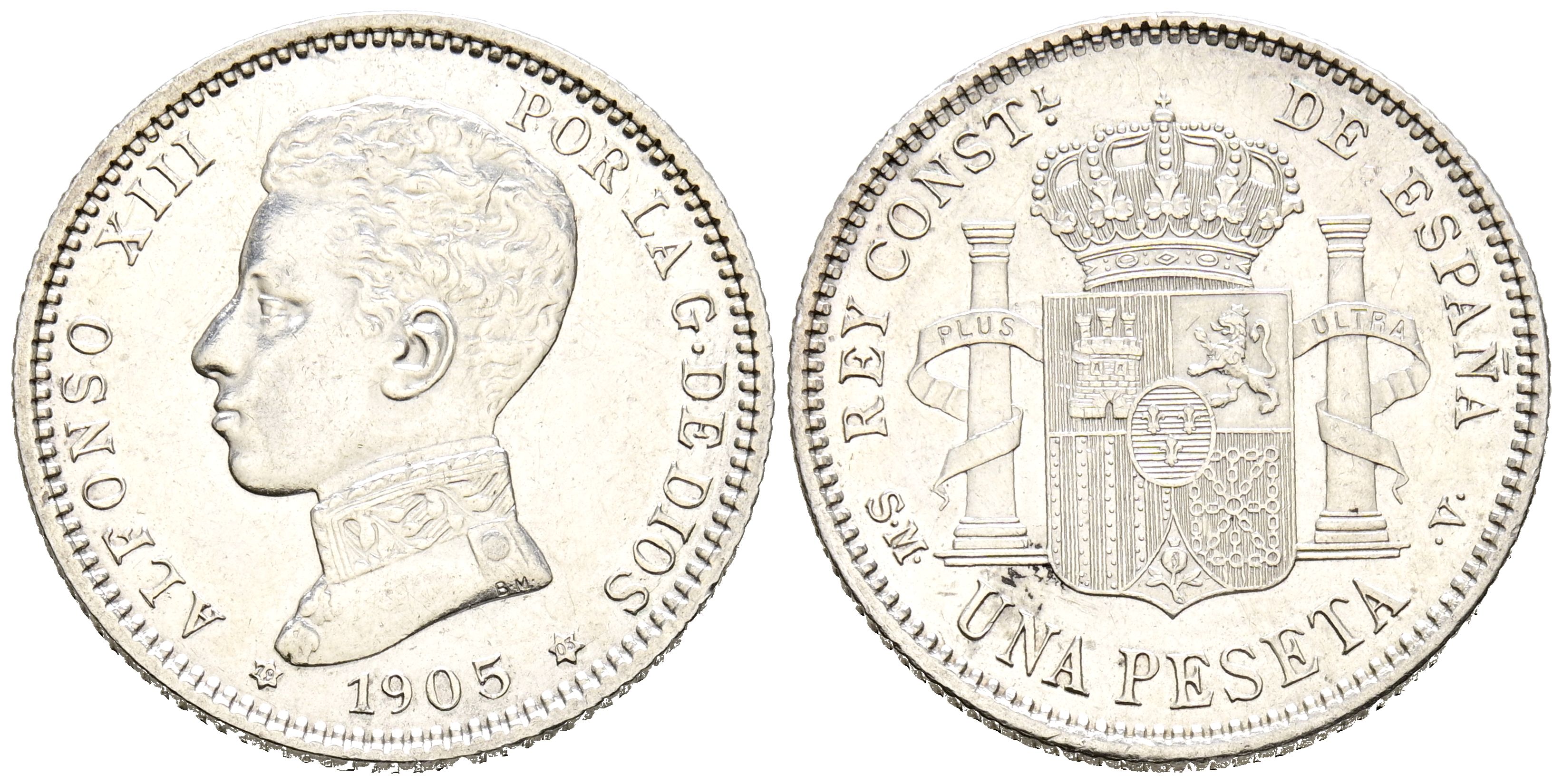 ALFONSO XIII (1885-1931). 1 Peseta. (Ar. 4,95g/23mm). 1905 * 19-05. Madrid SMV. (Cal-2019-70). VF+. Cleaned. Scarce.