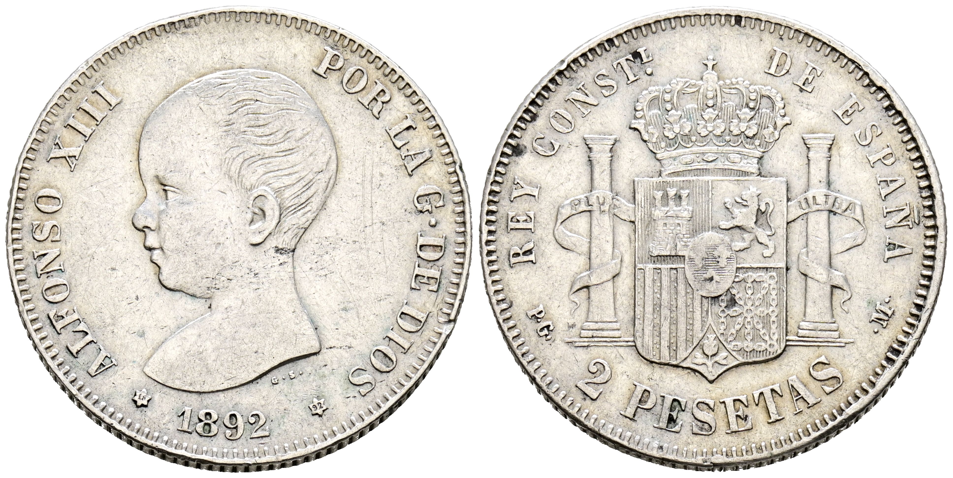 ALFONSO XIII (1885-1931). 2 Pesetas. (Ar. 9.82g/27mm). 1892 *18-82. Madrid PG-M. (Cal-2019-85). Very Fine.