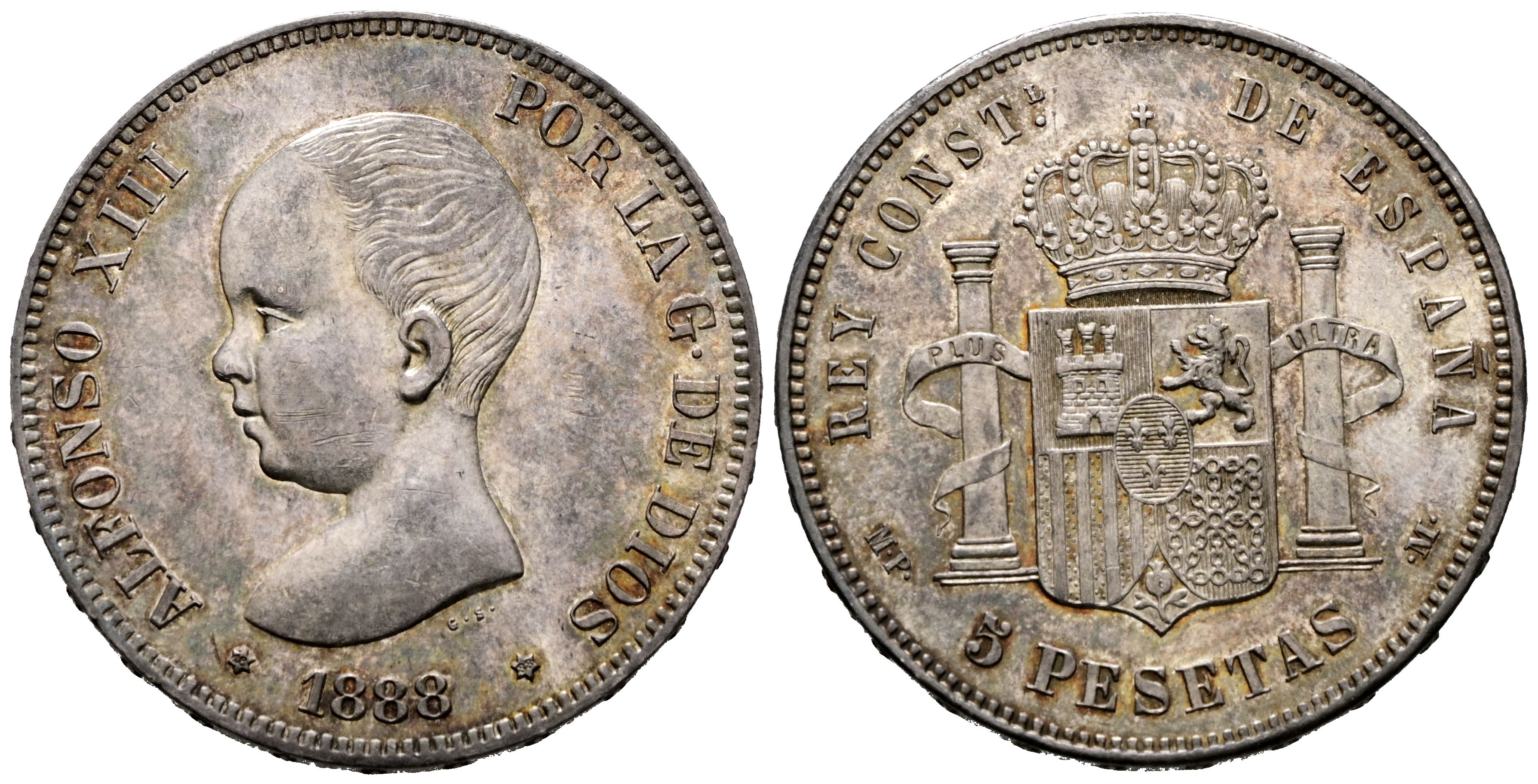 ALFONSO XIII (1885-1931). 5 Pesetas. (Ar. 24.96g/37mm). 1888 *18-88. Madrid MPM. (Cal-2019-92). Good Extremely Fine. Beautiful specimen showing practically all its original shine and a spectacular iridescent tone. Acquired from Juan R. Cayón in the 1980s, keeping the purchase record.
