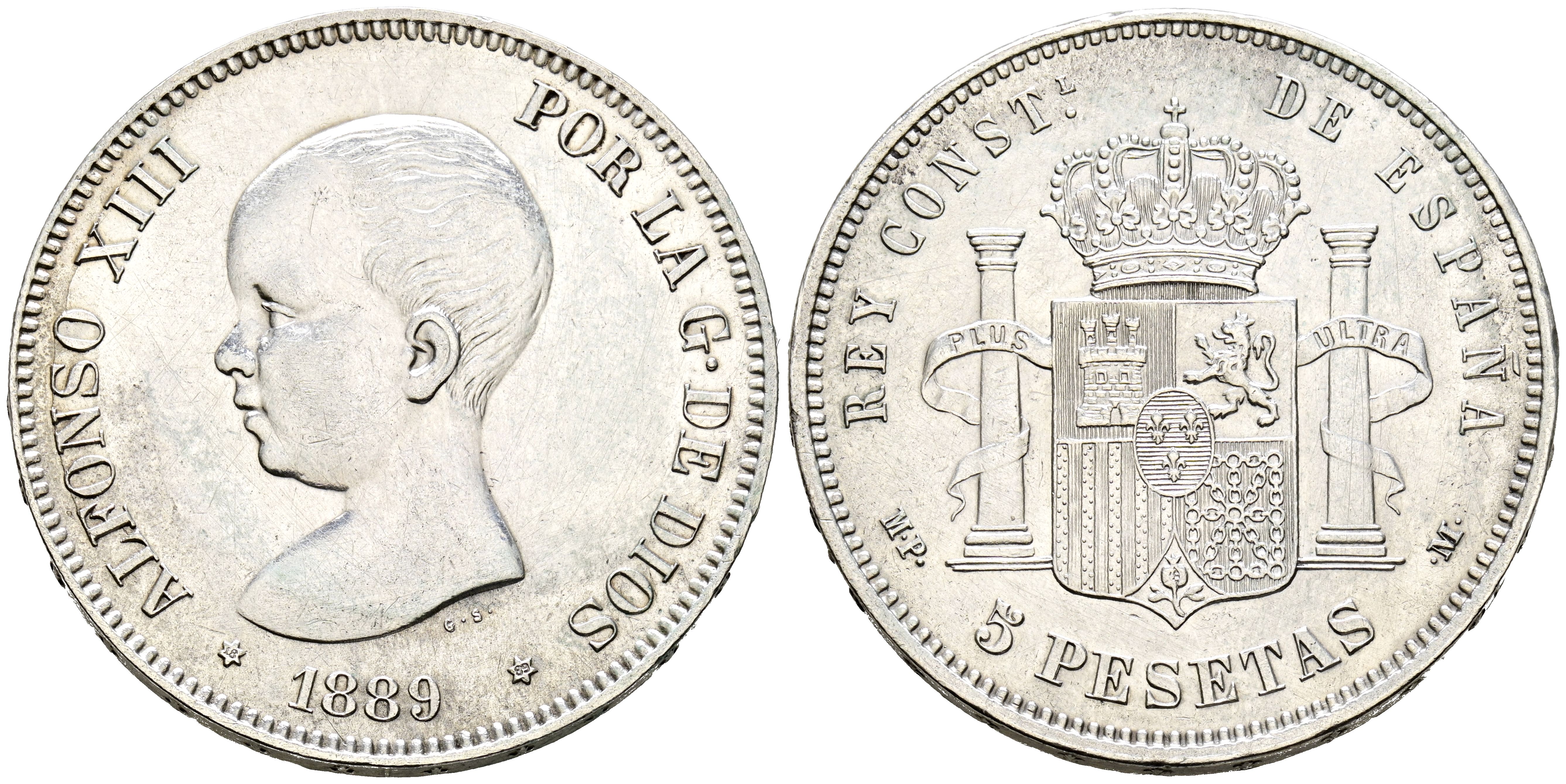 ALFONSO XIII (1885-1931). 5 Pesetas. (Ar. 24,81g/37mm). 1889 *18-89. Madrid MPM. (Cal-2019-93). Good Very Fine. Cleaned.