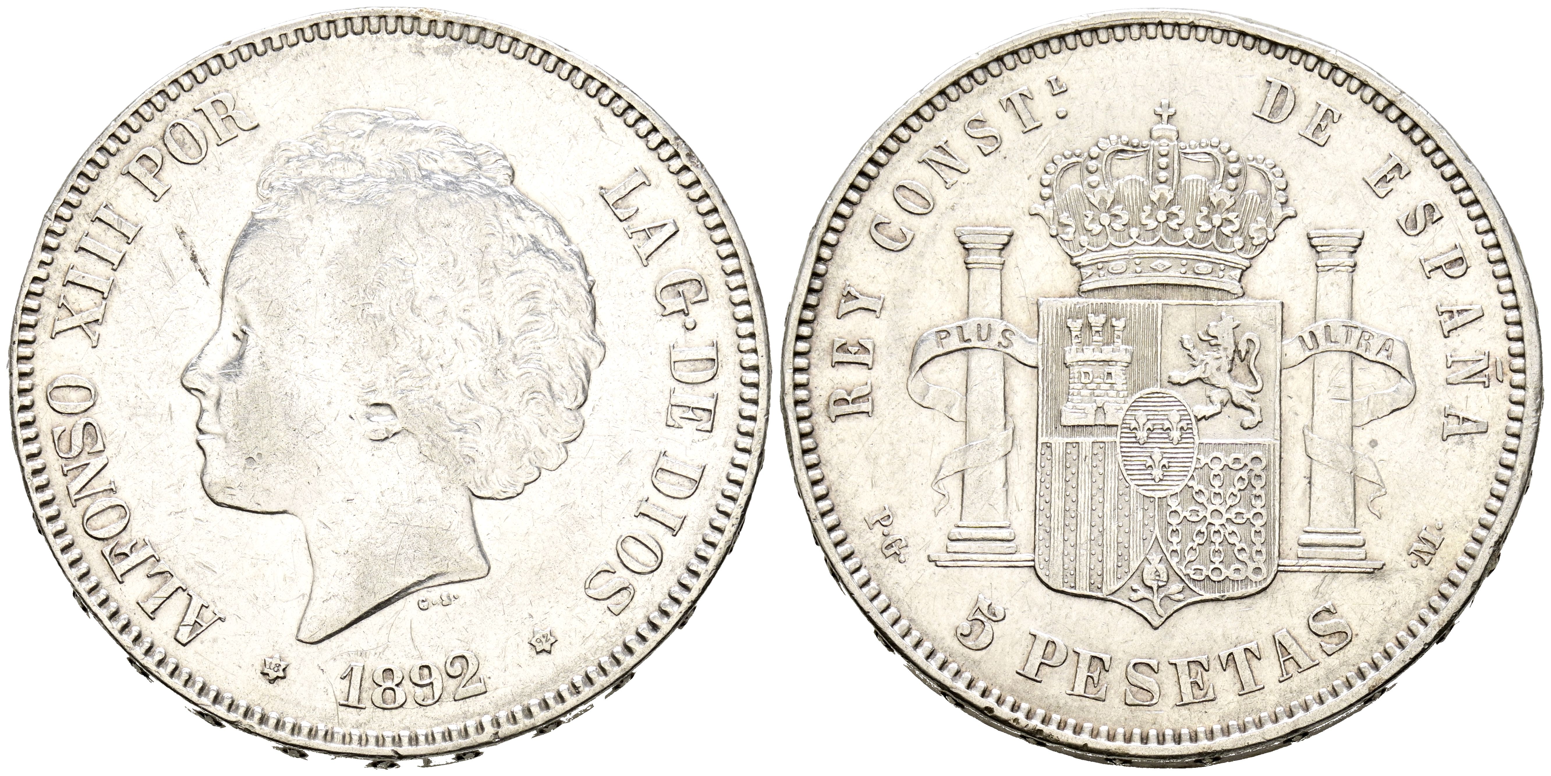 ALFONSO XIII (1885-1931). 5 Pesetas. (Ar. 25.04g/37mm). 1892 *18-92. Madrid PGM. (Cal-2019-100). Very Fine.