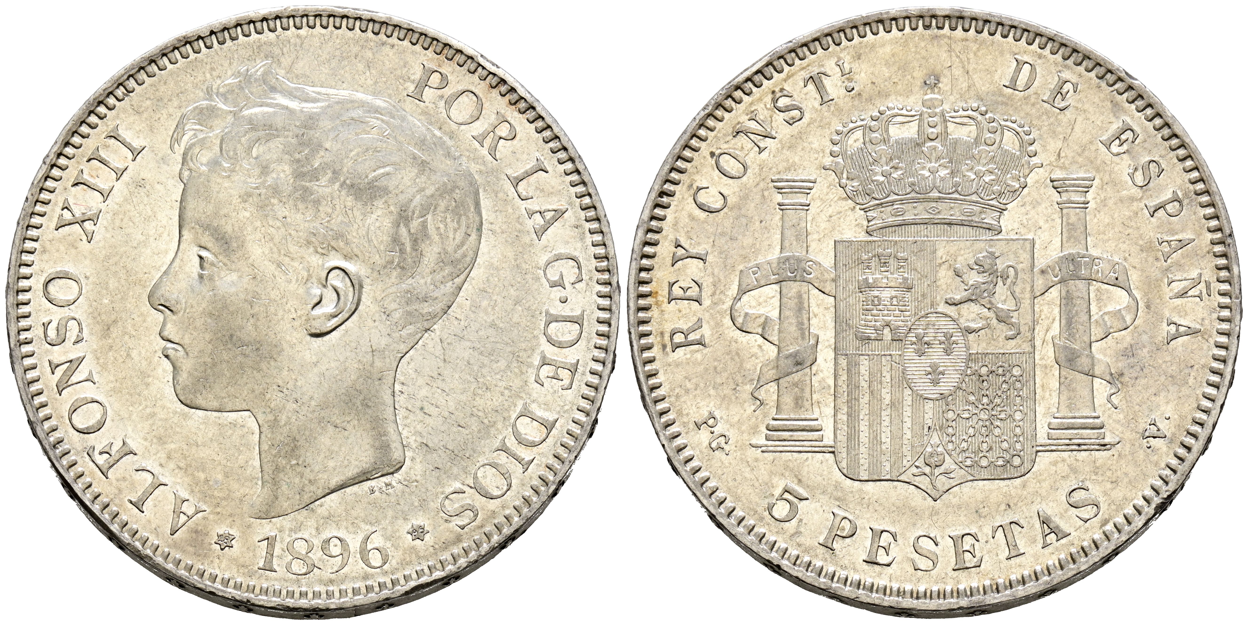 ALFONSO XIII (1885-1931). 5 Pesetas. (Ar. 24,79g /37mm). 1896 *18-96. Madrid PGV. (Cal-2019-106). Extremely Fine-. Light marks. Remains of original shine.