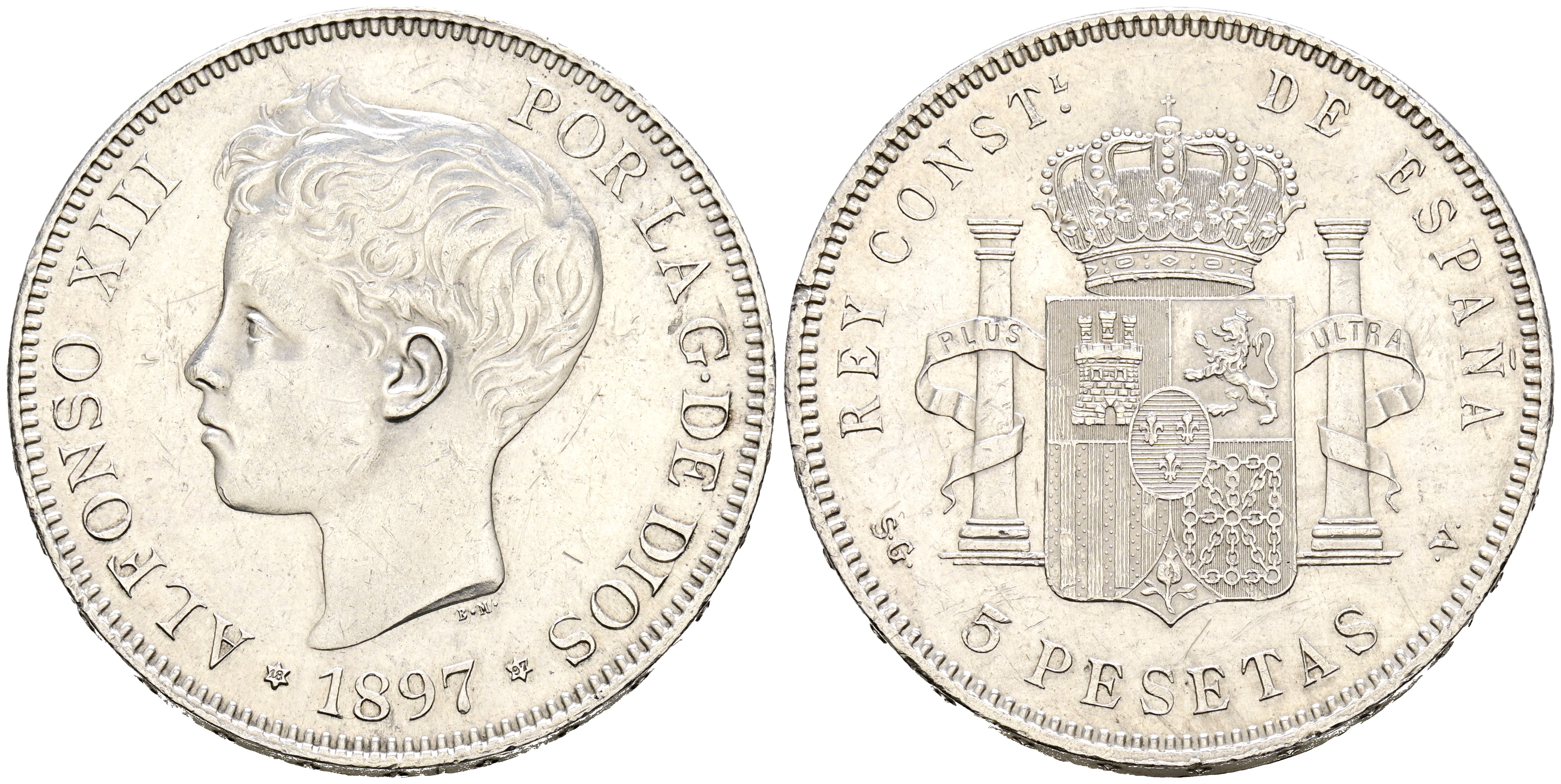 ALFONSO XIII (1885-1931). 5 Pesetas. (Ar. 25,12g /37mm). 1897 *18-97. Madrid SGV. (Cal-2019-107). Extremely Fine-. Cleaned.