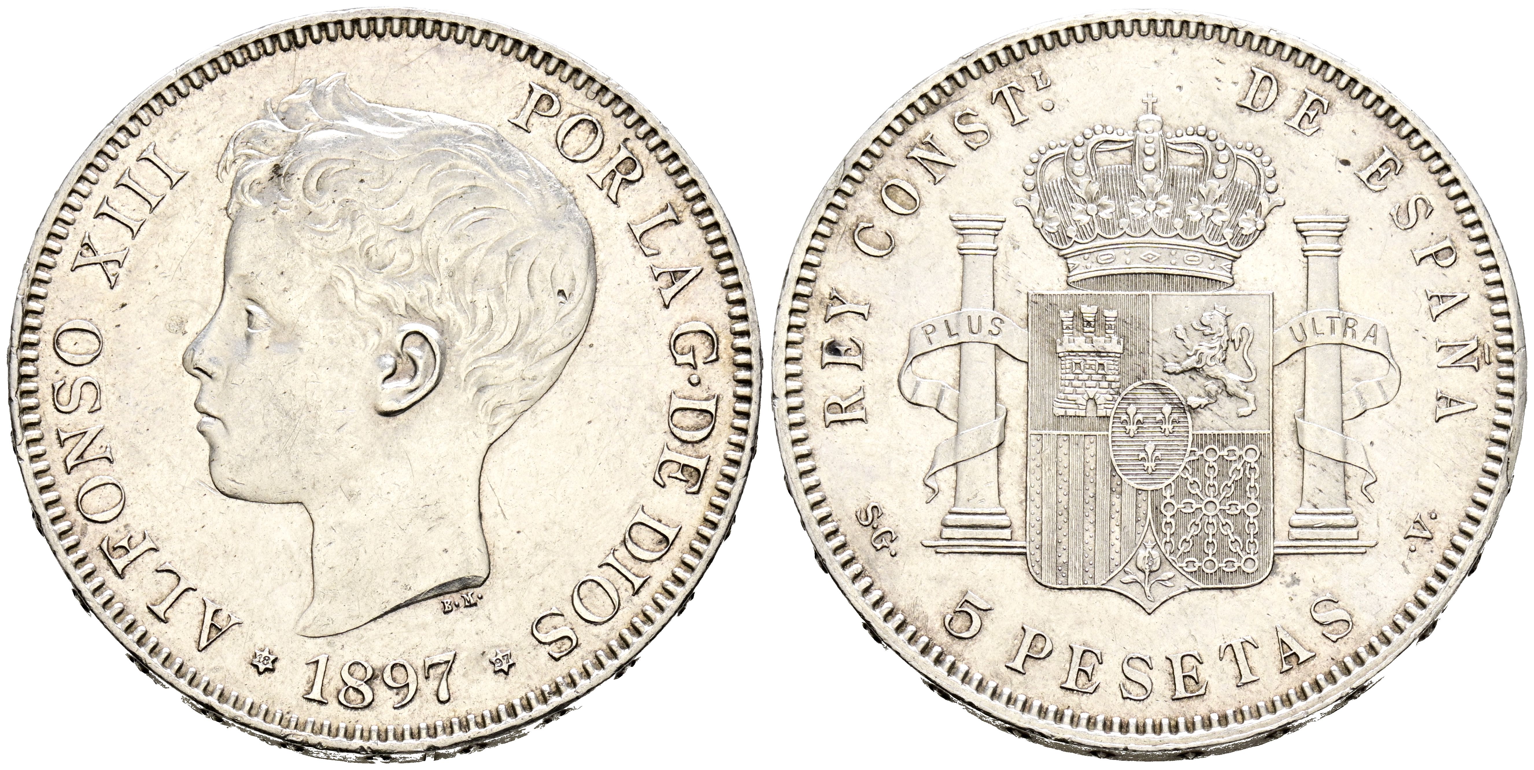 English ALFONSO XIII (1885-1931). 5 Pesetas. (Ar. 25.06g/37mm). 1897 *18-97. Madrid SGV. (Cal-2019-107). Extremely Fine-. Remnants of original shine.
