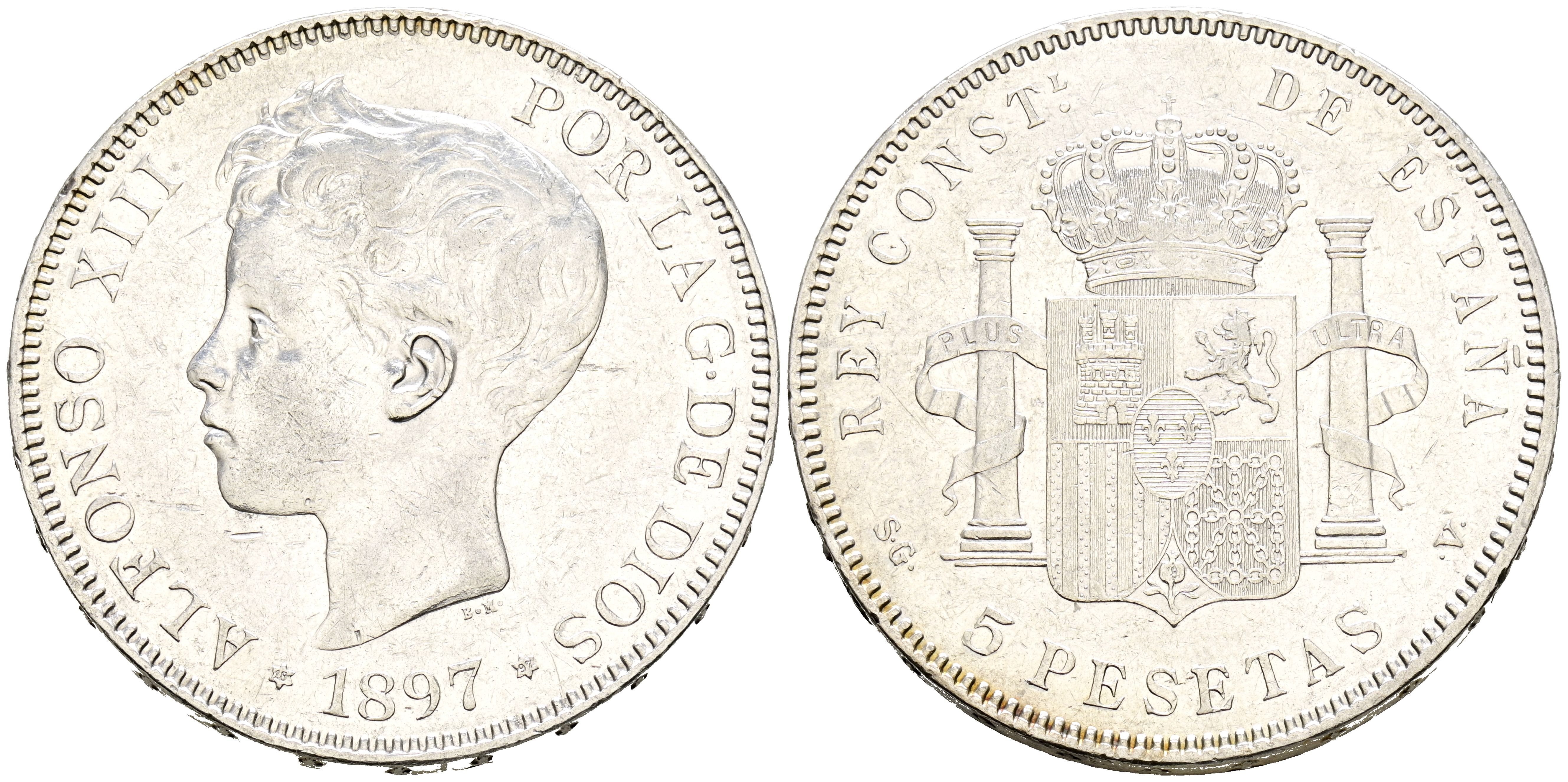 ALFONSO XIII (1885-1931). 5 pesetas. (Ar. 25,05g /37mm). 1897 *18-97. Madrid SGV. (Cal-2019-107). Good Very Fine. Cleaned.