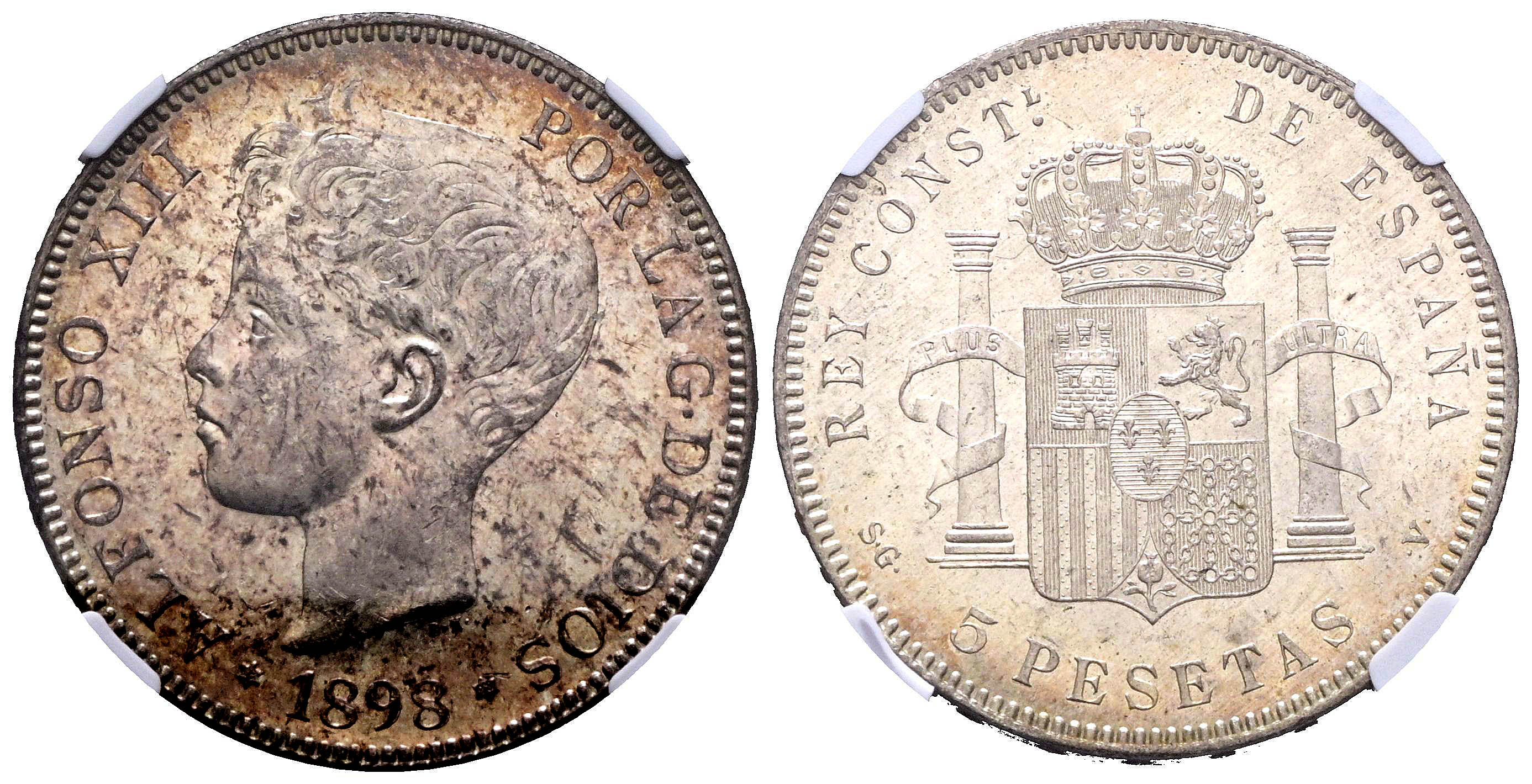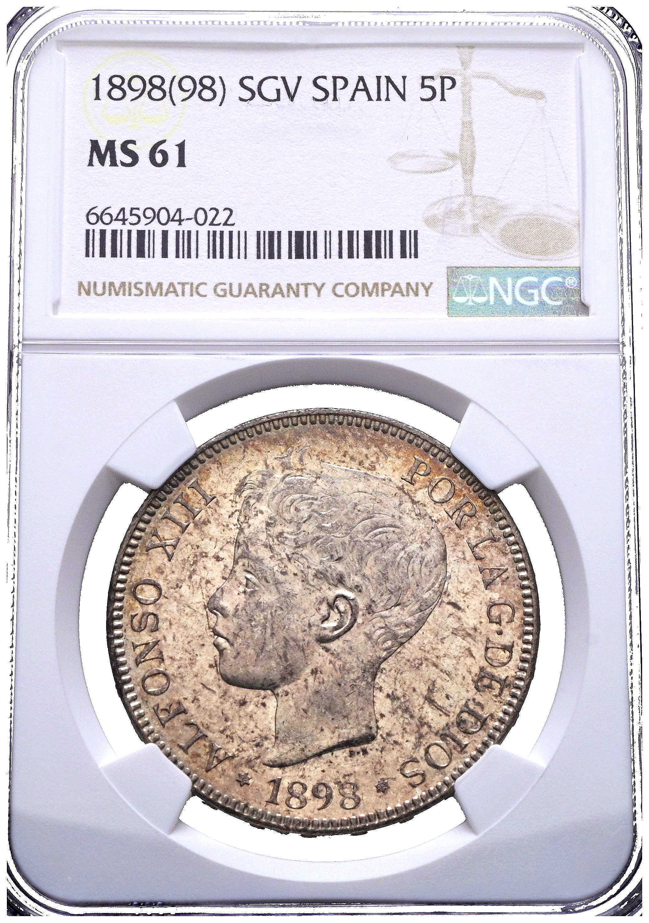 ALFONSO XIII (1885-1931). 5 Pesetas. (Ar. 25,00g/37mm)*. 1898 *18-98. Madrid SGV. (Cal-2019-109). Encapsulated by NGC MS 61. * Theoretical weight and measurements.