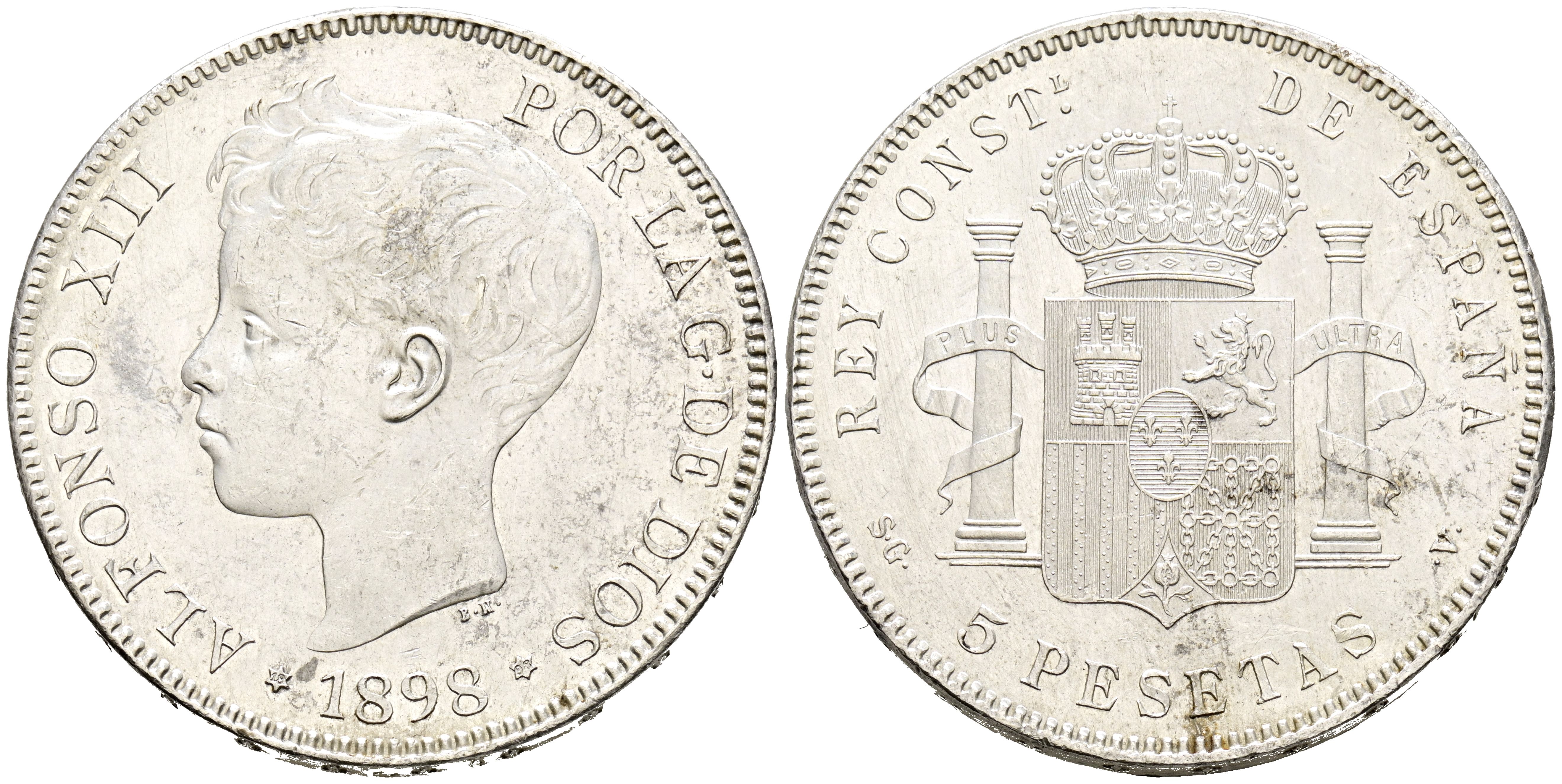 ALFONSO XIII (1885-1931). 5 Pesetas. (Ar. 25.44g/37mm). 1898 *18-98. Madrid SGV. (Cal-2019-109). Good Very Fine/Extremely Fine-. Marks.