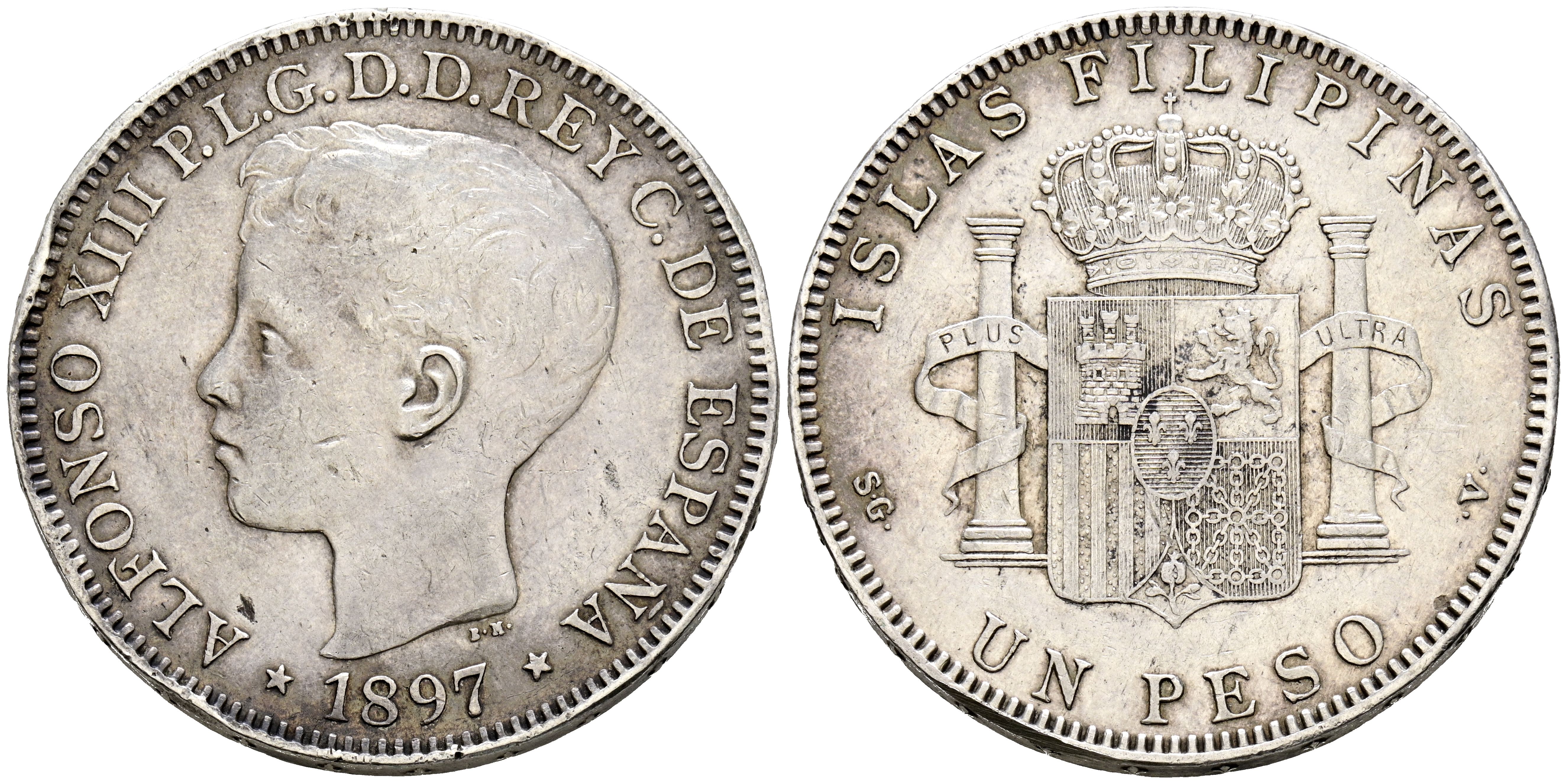 ALFONSO XIII (1885-1931). 1 Weight. (Ar. 24.90g/37mm). 1897. Manila SGV. (Cal-2019-122). Very Fine. Bumps on the obverse listel.