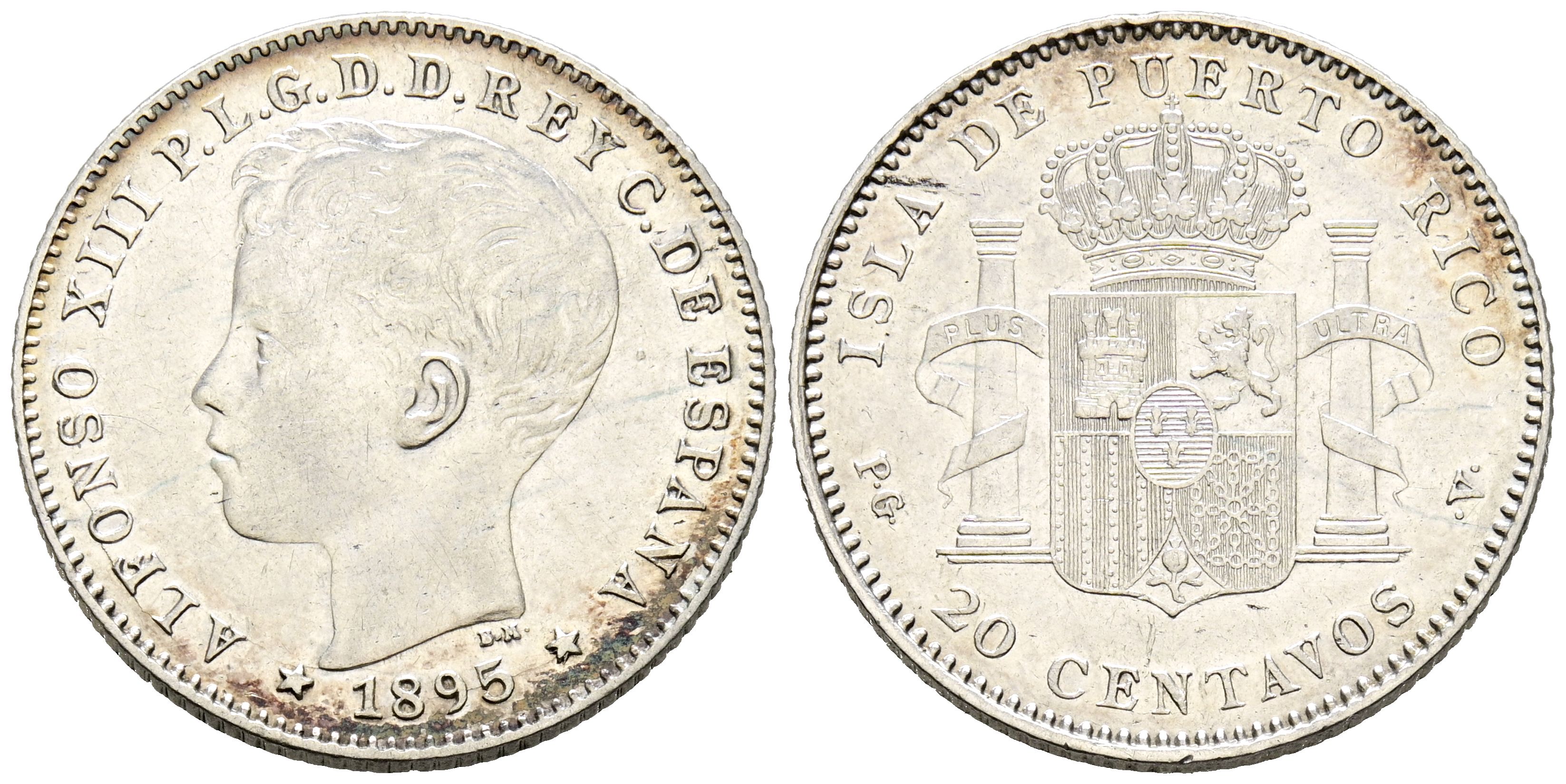 ALFONSO XIII (1885-1931). 20 Centavos. (Ar. 4.99g/27mm). 1895. Puerto Rico PGV. (Cal-2019-126). VF+. Scarce.