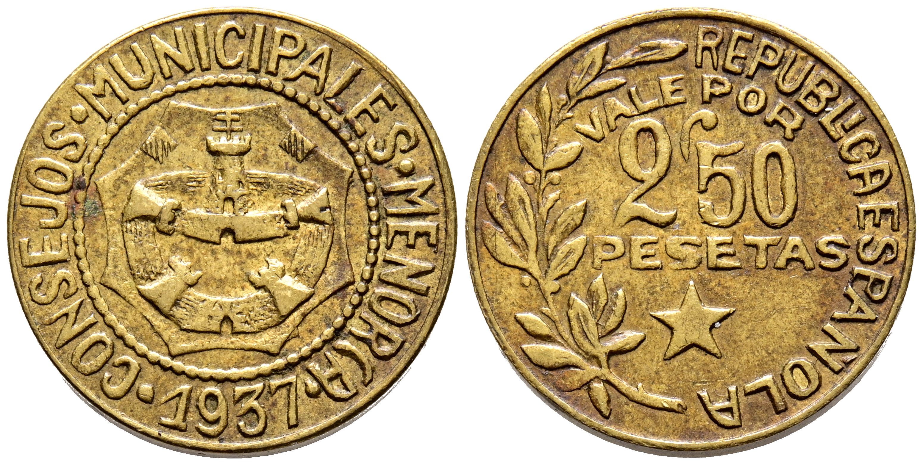CIVIL WAR (1936-1939). 2.5 Pesetas. (Ae. 3.88g/21mm). 1937. Menorca. (Cal-2019-24). VF+. Slight oxidation marks on reverse.