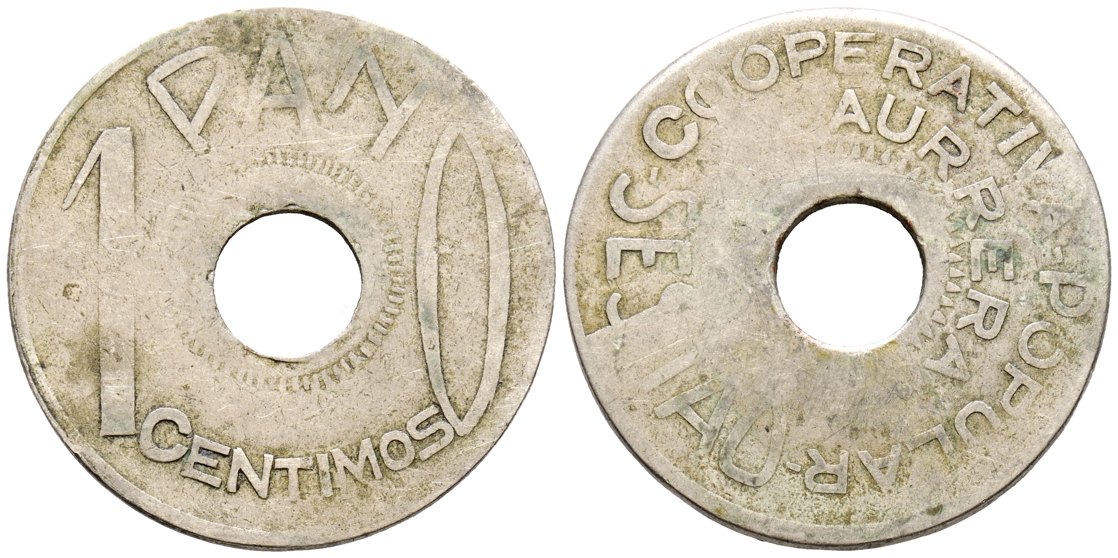 English AURRERÁ POPULAR COOPERATIVE. 10 Cents. Bread. Sestao. Good Fine. Scarce.