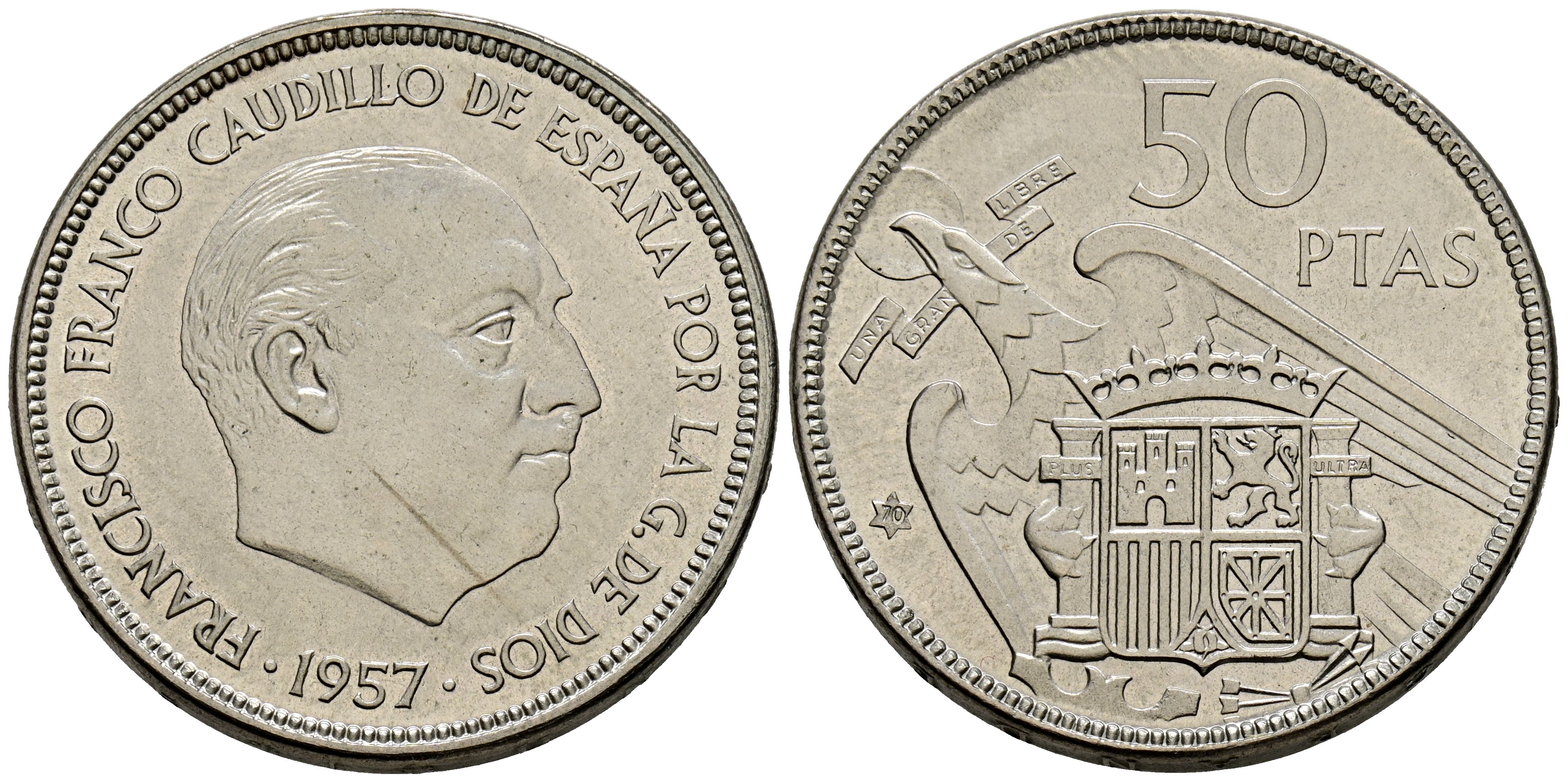 English SPANISH STATE (1936-1975). 50 Pesetas. (Ni. 12.59g/30mm). 1957 *70. Madrid. (Cal-2019-139). Good Extremely Fine. Scarce.