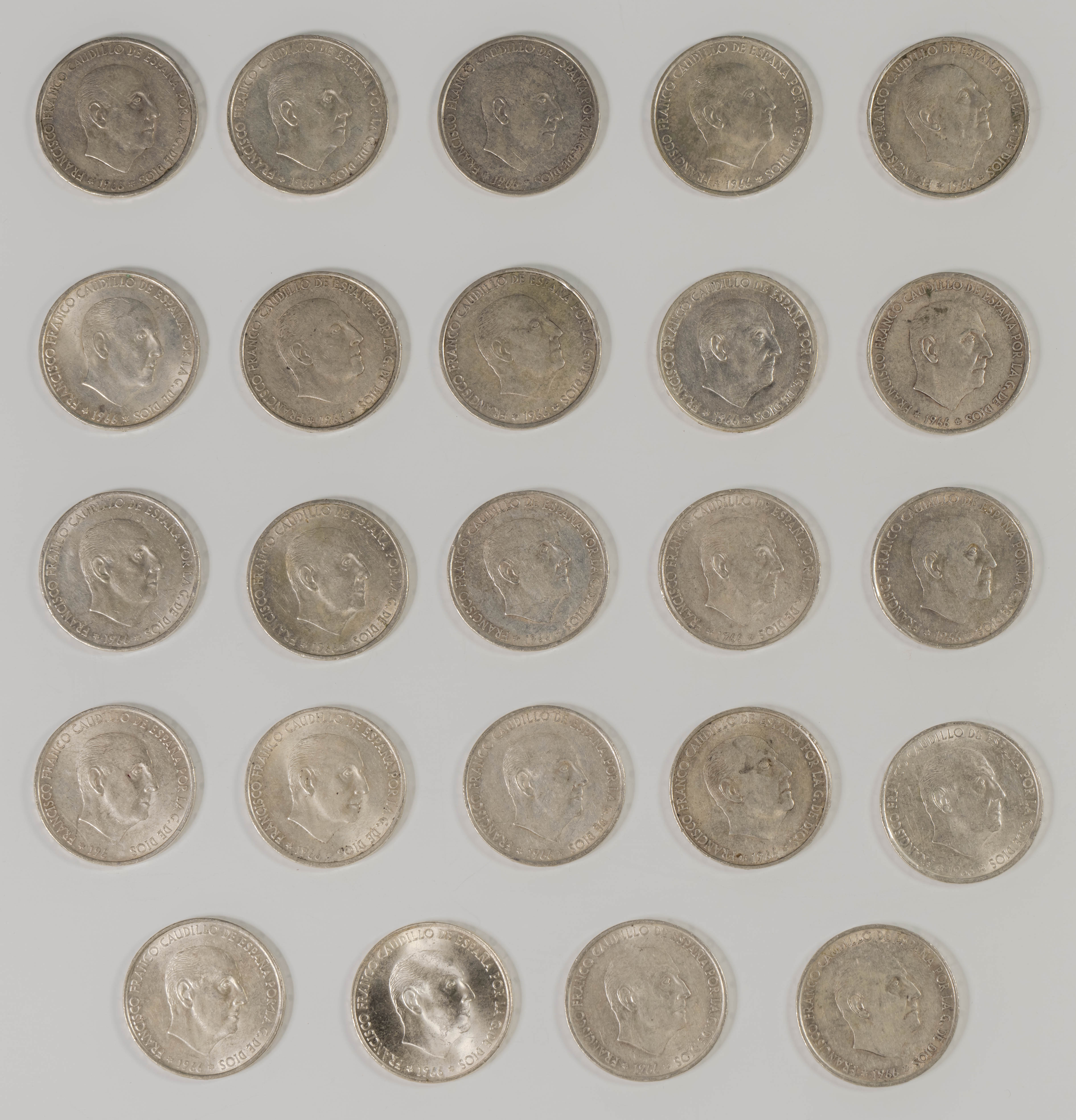 English SPANISH STATE (1936-1975). Set of 24 silver 100 Pesetas coins from 1966 (all stars represented except *69). Different states of preservation. TO BE EXAMINED.