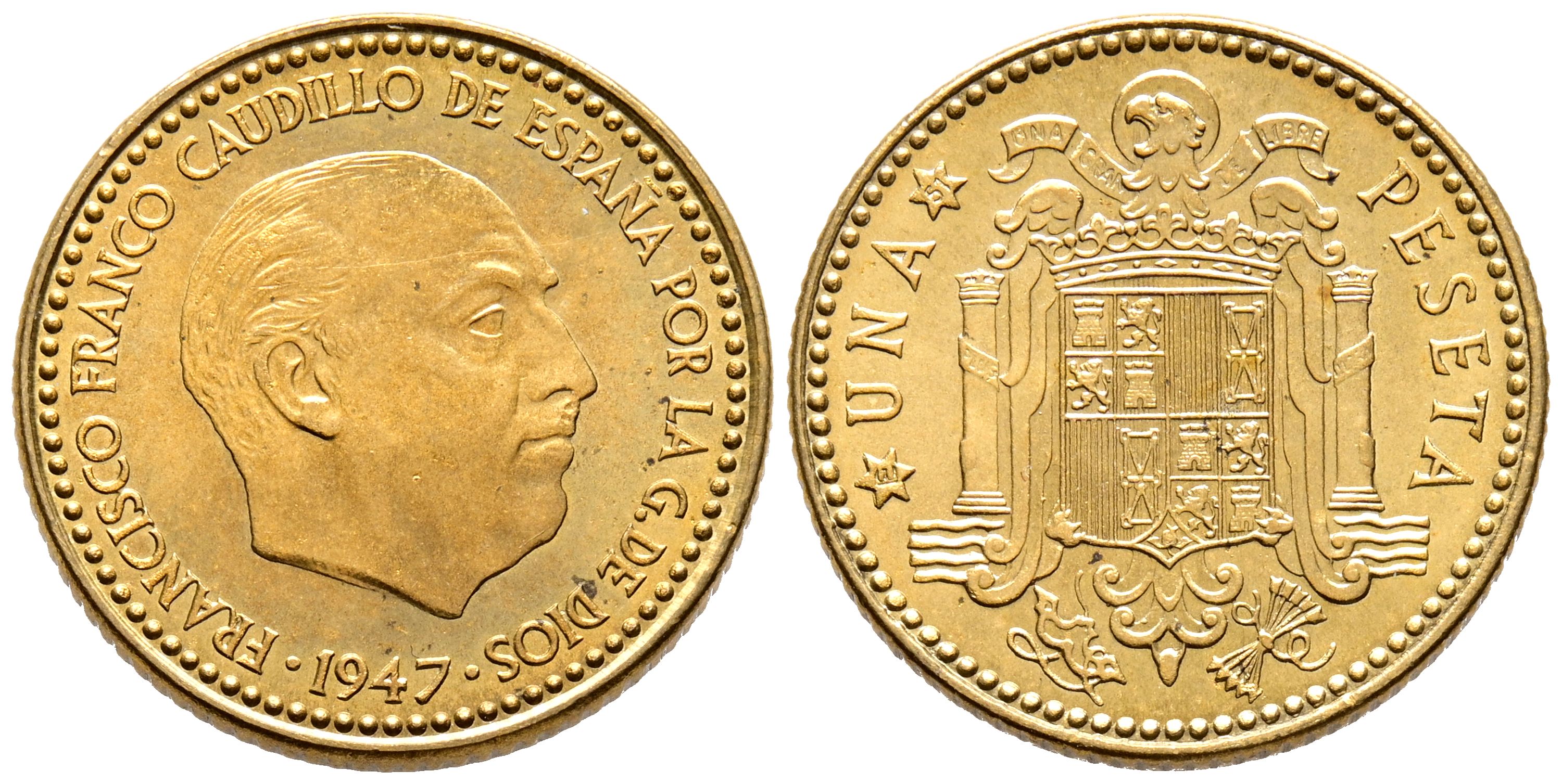 SPANISH STATE (1936-1975). 1 Peseta. (Al-Cu. 3.41g/21mm). 1947 *E-51. Madrid. II National Numismatic Exhibition. (Cal-2019-151). Uncirculated. Beautiful patina. Scarce.