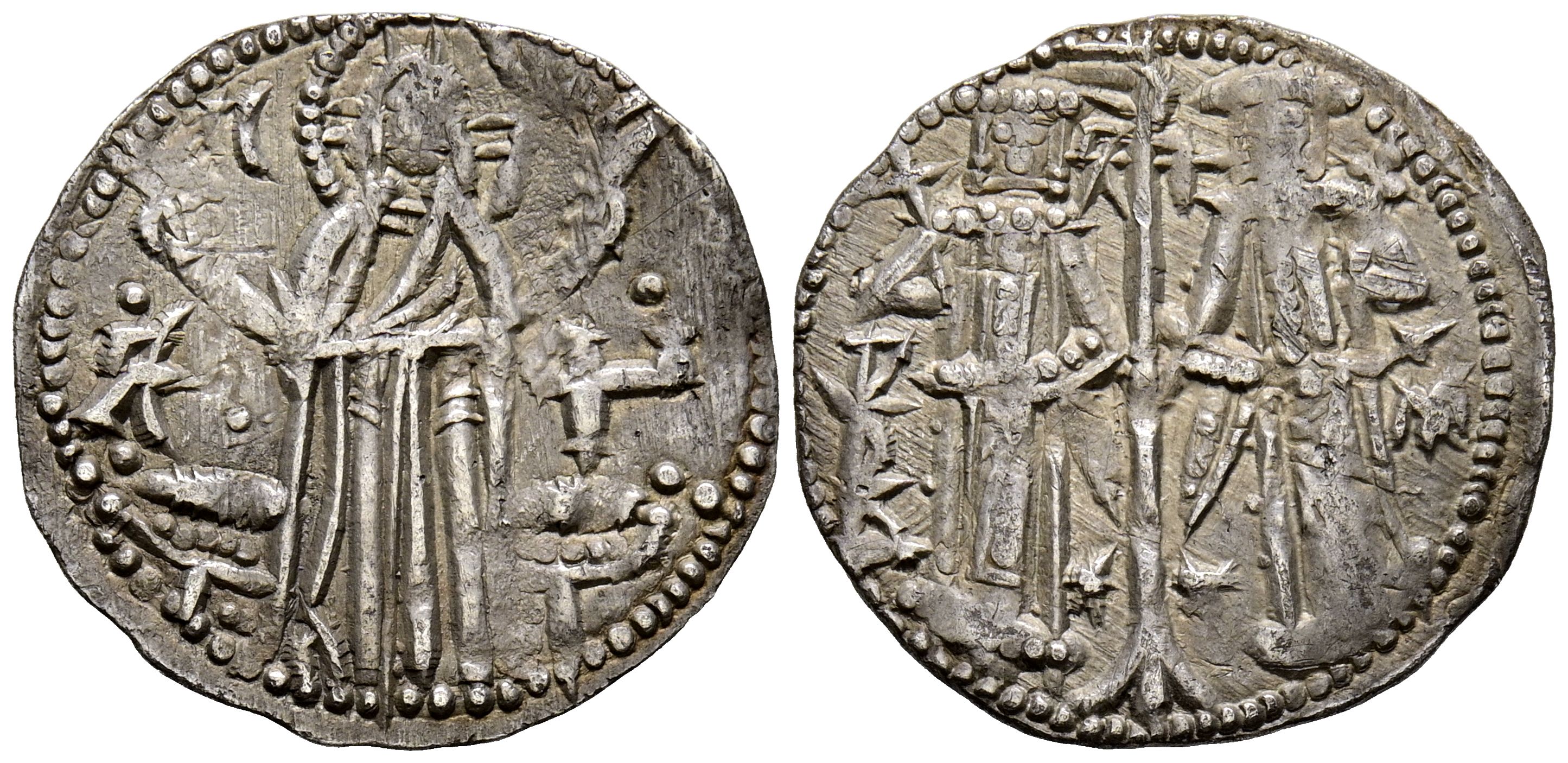 English BULGARIA - Second Empire, Ivan Alexander. Grosh. (Ar. 1.60g/20mm). 1331-1355. (Dimnik 9.1. 2; Youroukov-Penchev 74-80). Obv: Christ with a halo and standing facing forward on a throne raising his hand in a sign of blessing, at either side of his head IC - XC, likewise on the throne, monogram: АΛЕ (Alexander) - ЦР (Tsar). Reverse: The Tsar and his son Michael Asen standing with a sceptre in a vertical position, between them, a standard with a long pole and a three-foot base, flanked at the top again by the monograms ''Alexander'' and ''Za'' and below by two stars. In the left and right field, monograms ''Pius'' and ''Michael''. VF+.