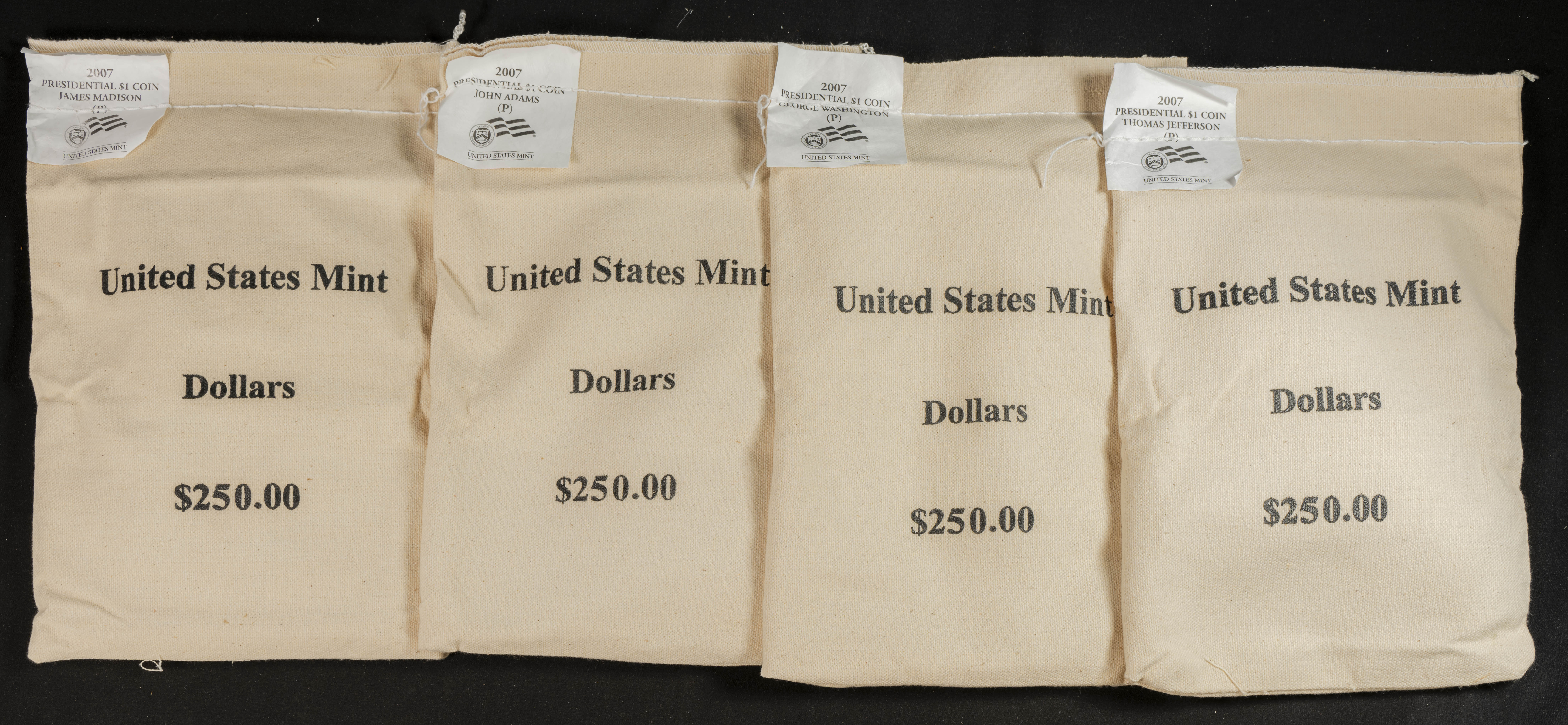 UNITED STATES. 4 United States Mint cloth bags with 1000 1 Dollar coins of the presidents: George Washington, John Adams, Thomas Jefferson and James Madison. Total weight of the set: 8.130 Kg. TO BE EXAMINED.