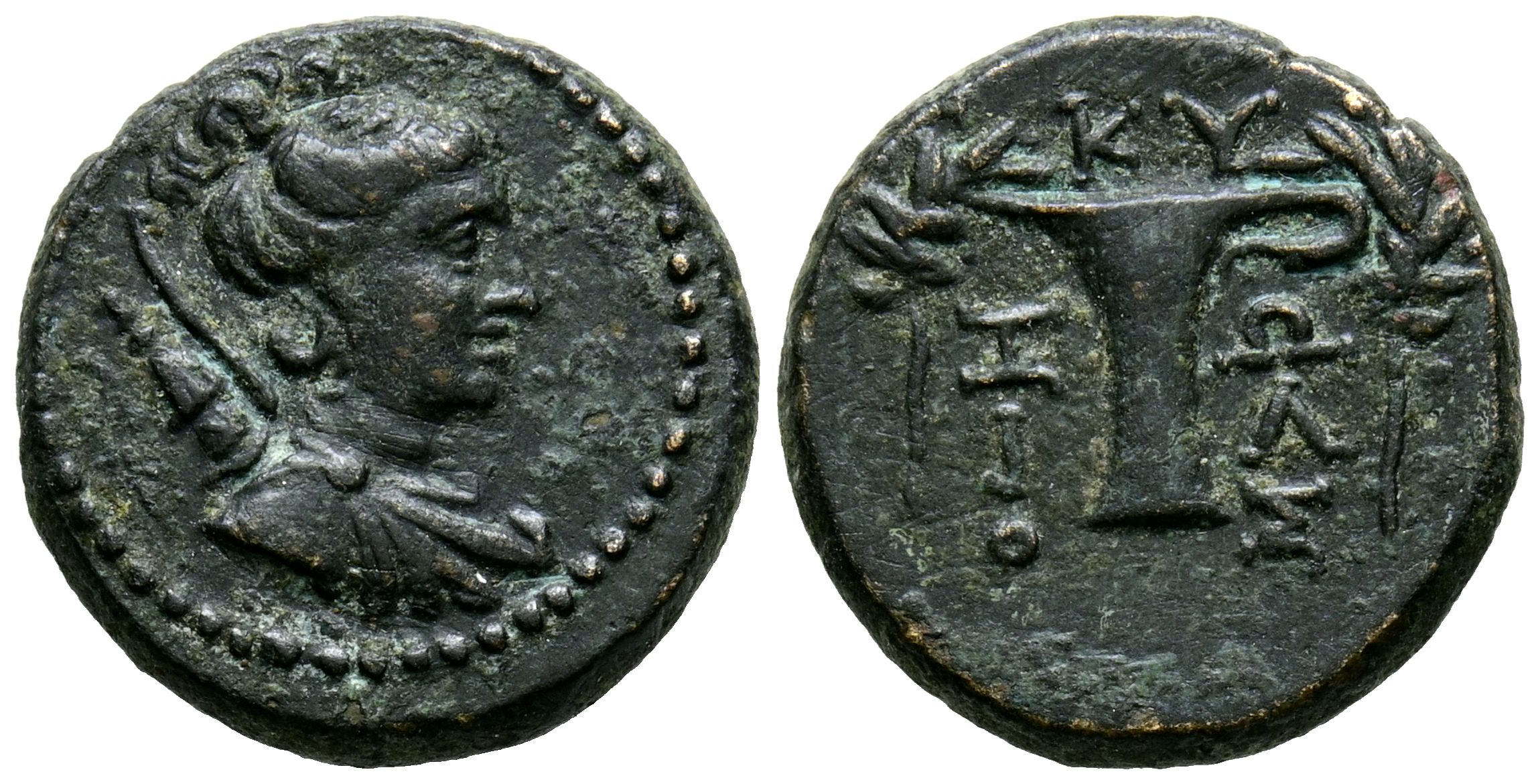 AEOLIS, Kyme. Ae16. (Ae. 2.35g/16mm). 1st-2nd century Fine Zoilos, magistrate. (SNG Copenhagen 108). Obv: Bust of Artemis facing right, bow and quiver on shoulder within dotted graffito. Reverse: Cup with handle left, above: KY, sides: Ζ-Ο-Ι-Λ-Ο-Σ and laurel branch left and right. VF+.