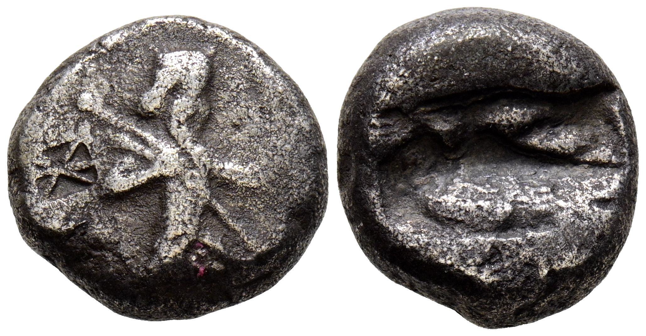 ACHAMEMENID EMPIRE, Time of Xerxes I to Darius II. Centuries. (Ar. 5.29g/14mm). 485-420 Fine Sardis. (Sunrise 25). Obv: Persian king kneeling right carrying bow and spear and quiver on his back. Reverse: Square incuse. VF-.