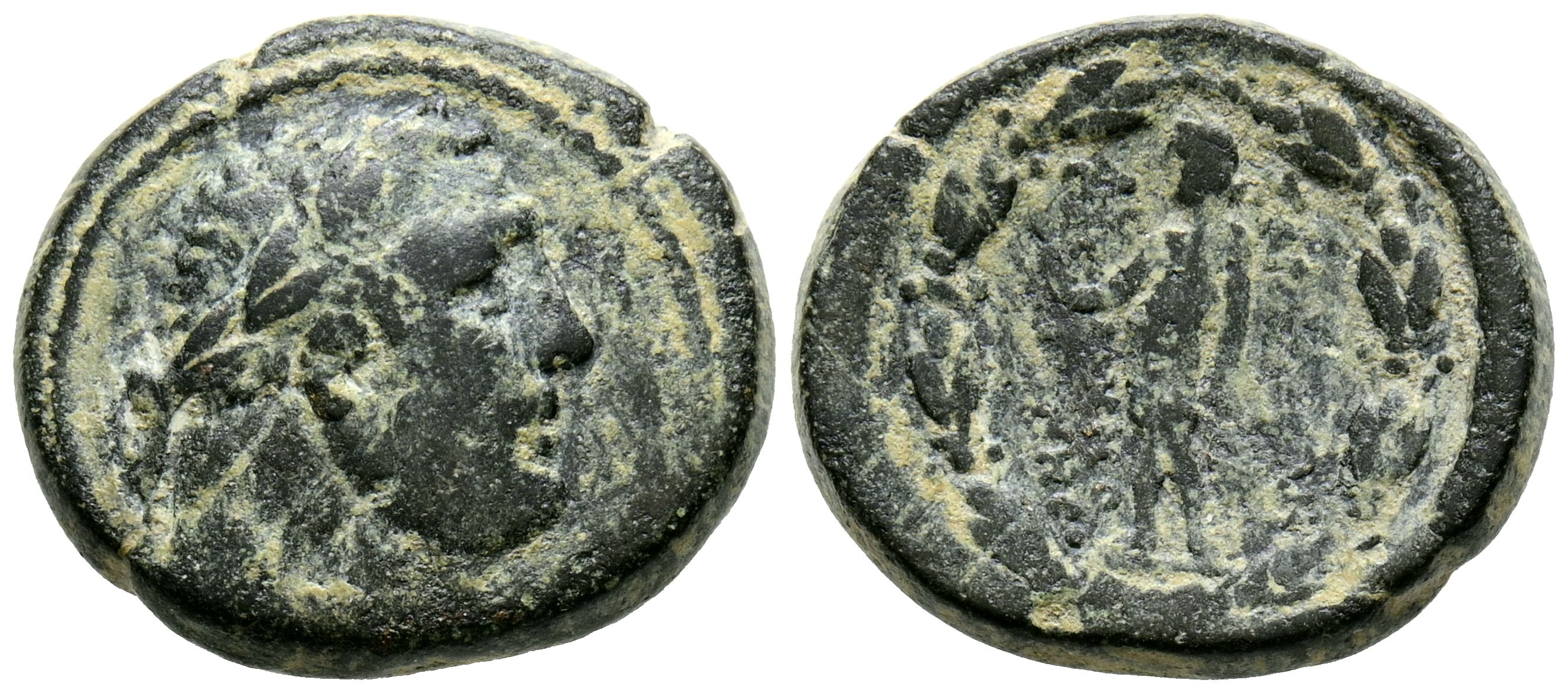 LYDIA, Sardis. Ae18. (Ae. 5.59g/18mm). 133 Fine-14 AD (SNG Copenhagen 493). Ob: Laureate bust of Heracles right. Reverse: Apollo standing left within laurel wreath. VF-.