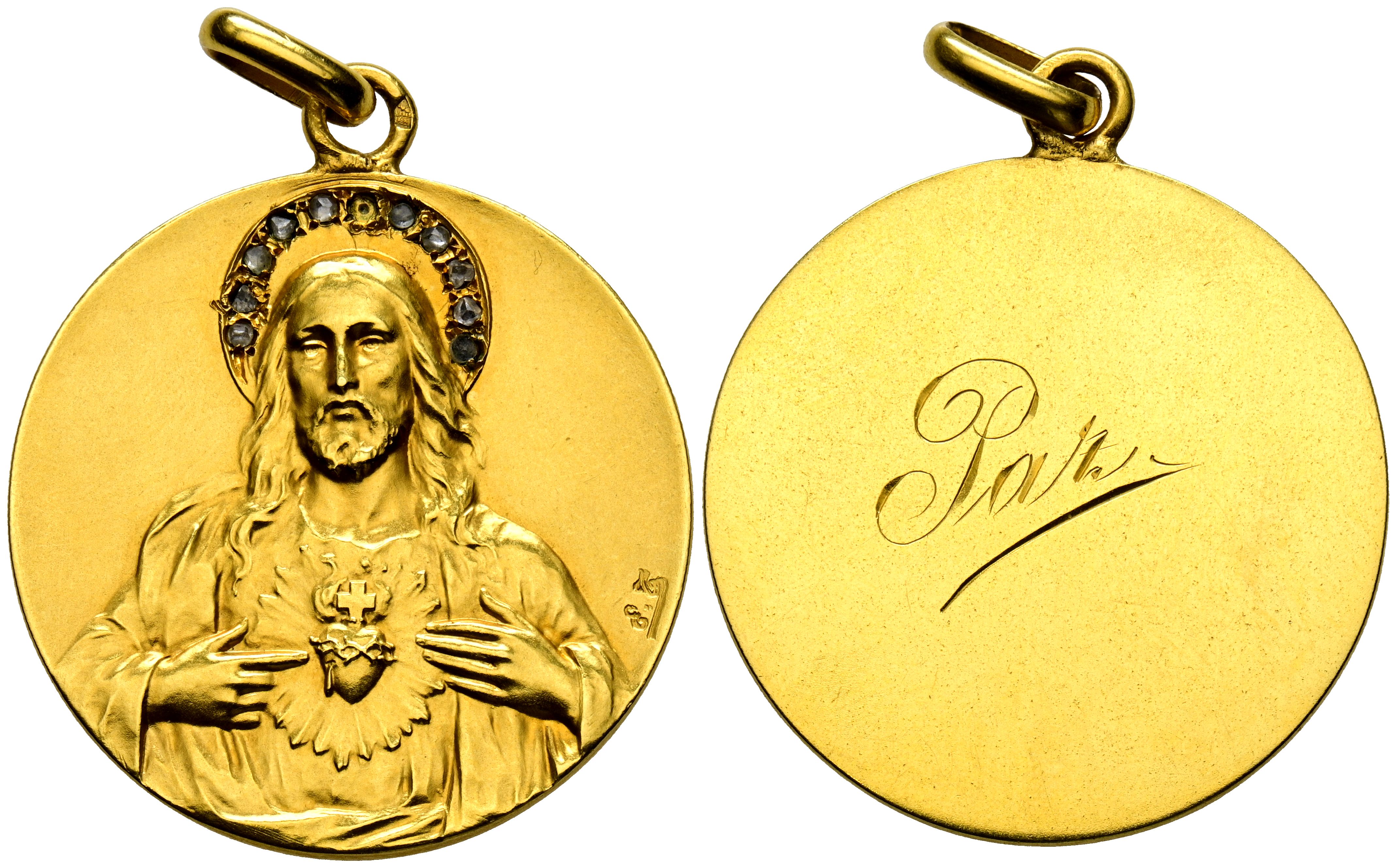 SACRED HEART. (Au. 10.94g/30mm). Halo with rhinestones, initials marked on the obverse and Peace on the reverse. 0.500 thousandths gold. With ring. VAT.