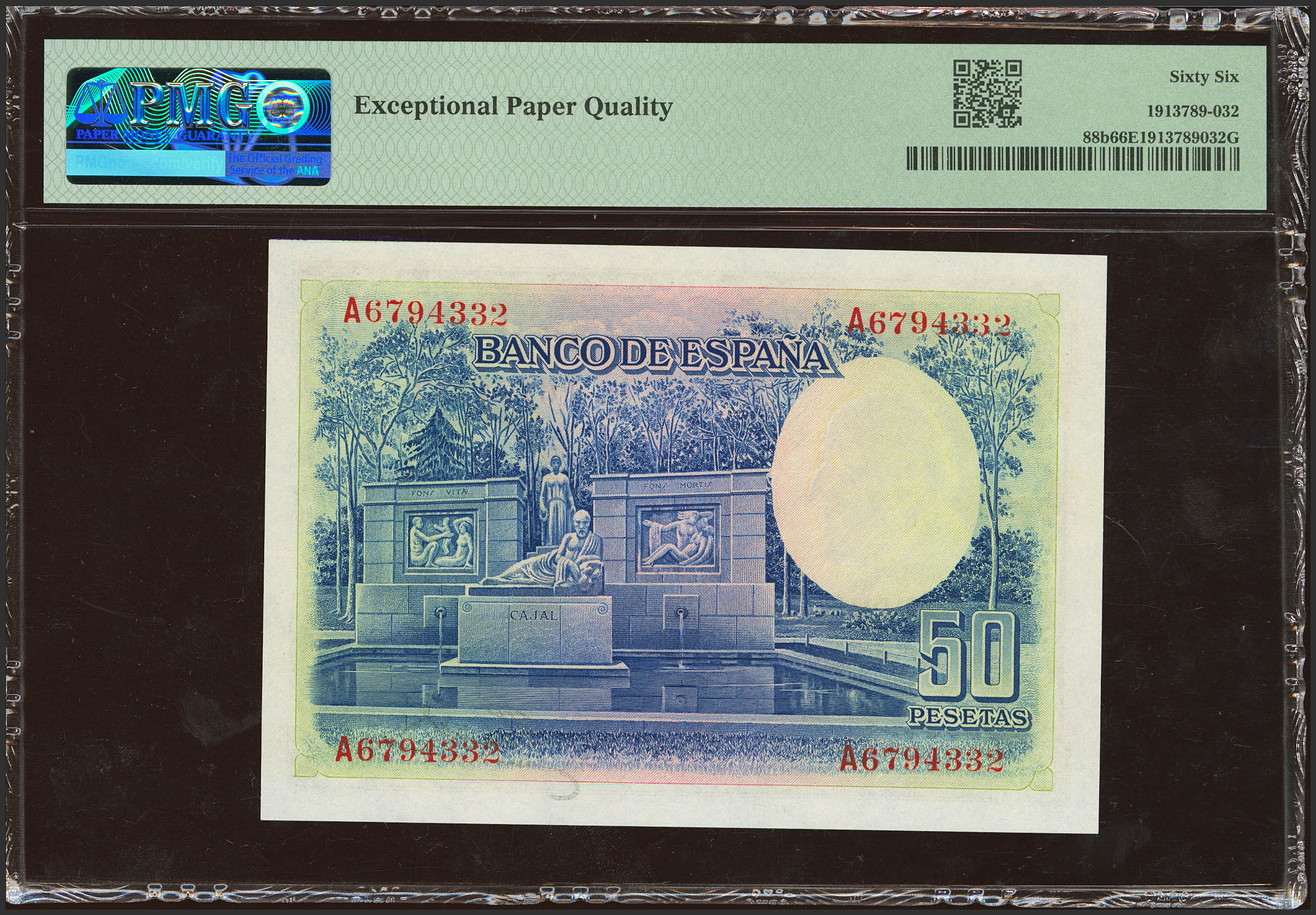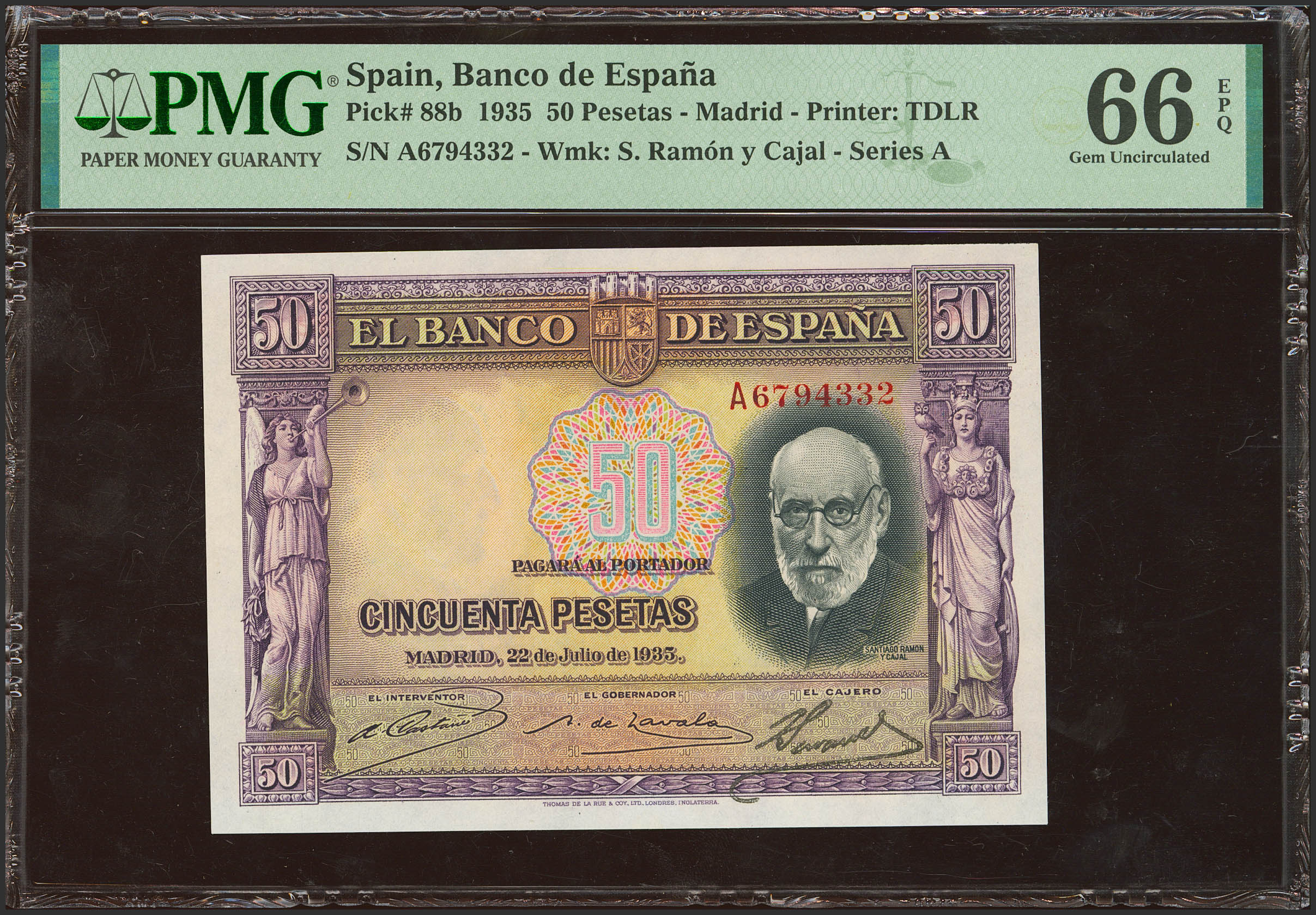 English 50 Pesetas. July 22, 1935. Series A. (Edifil 2021: 366a, Pick: 88b). Original marking. Uncirculated. Encapsulated PMG66EPQ.