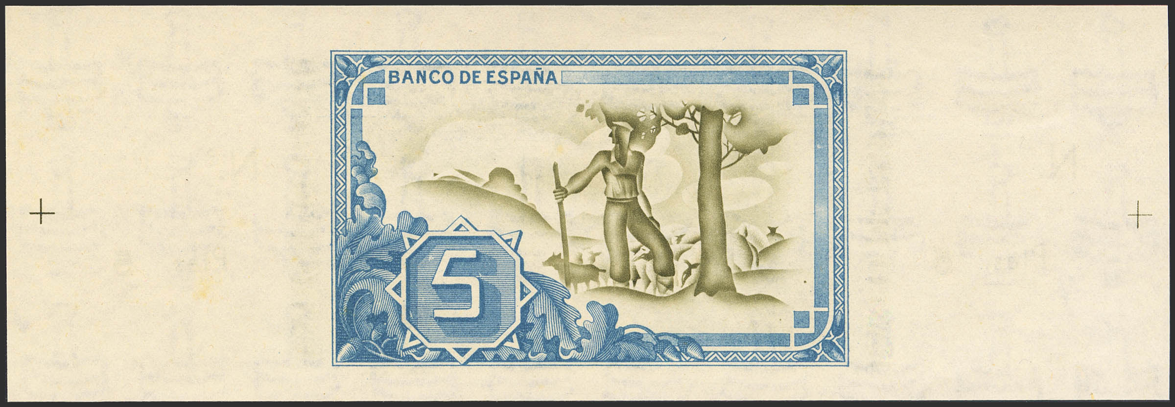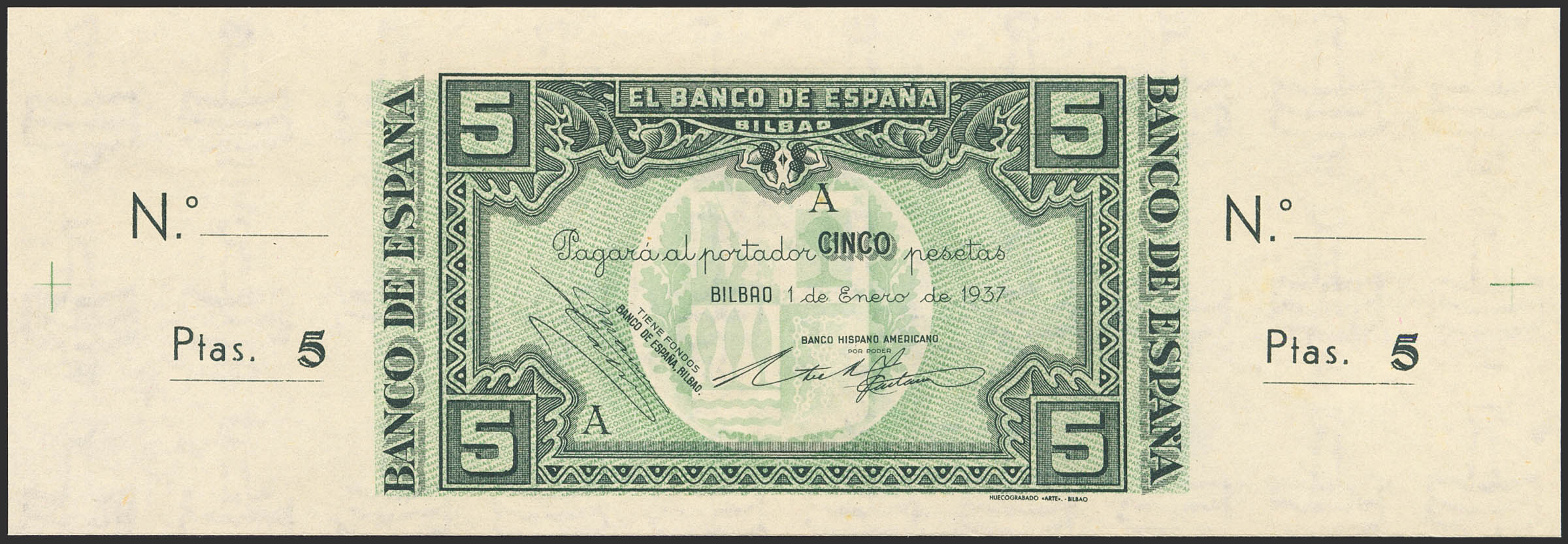 5 Pesetas. January 1, 1937. Bilbao branch, Banco Hispano Americano signature. Series A and unnumbered, with both matrices. (Edifil 2023: 386a). Original marking. Uncirculated.