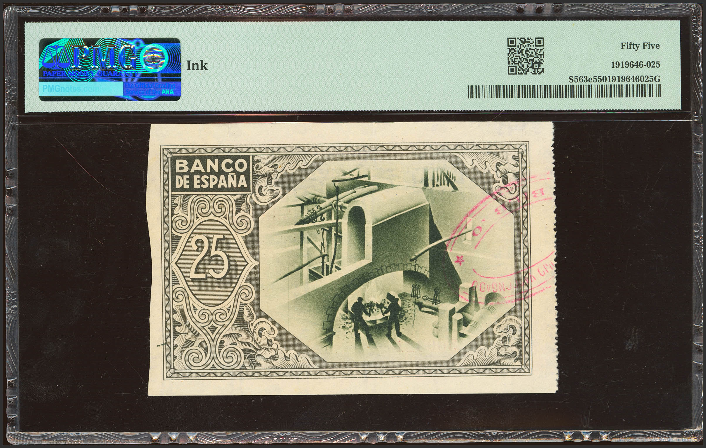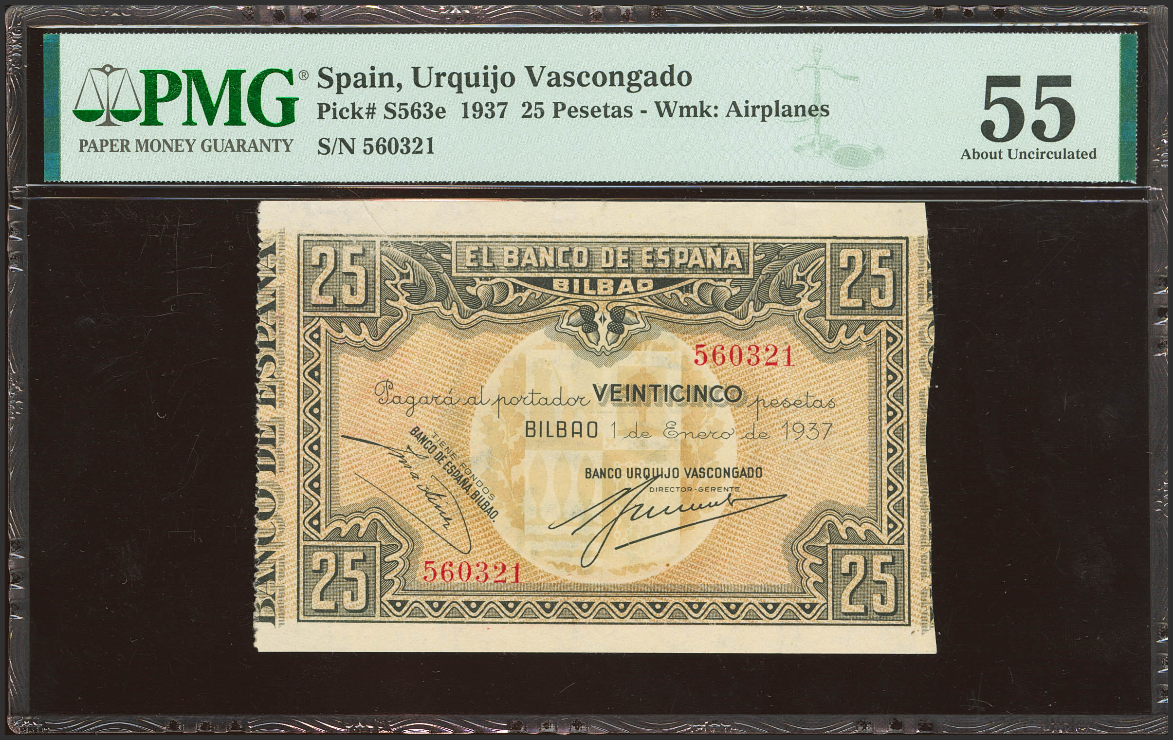 25 Pesetas. January 1, 1937. Bilbao branch, Banco Urquijo Vascongado signature. Without series, with numbering and without matrices. (Edifil 2023: 388c, Pick: S563e). Extremely Fine. Encapsulated PMG55 (ink).