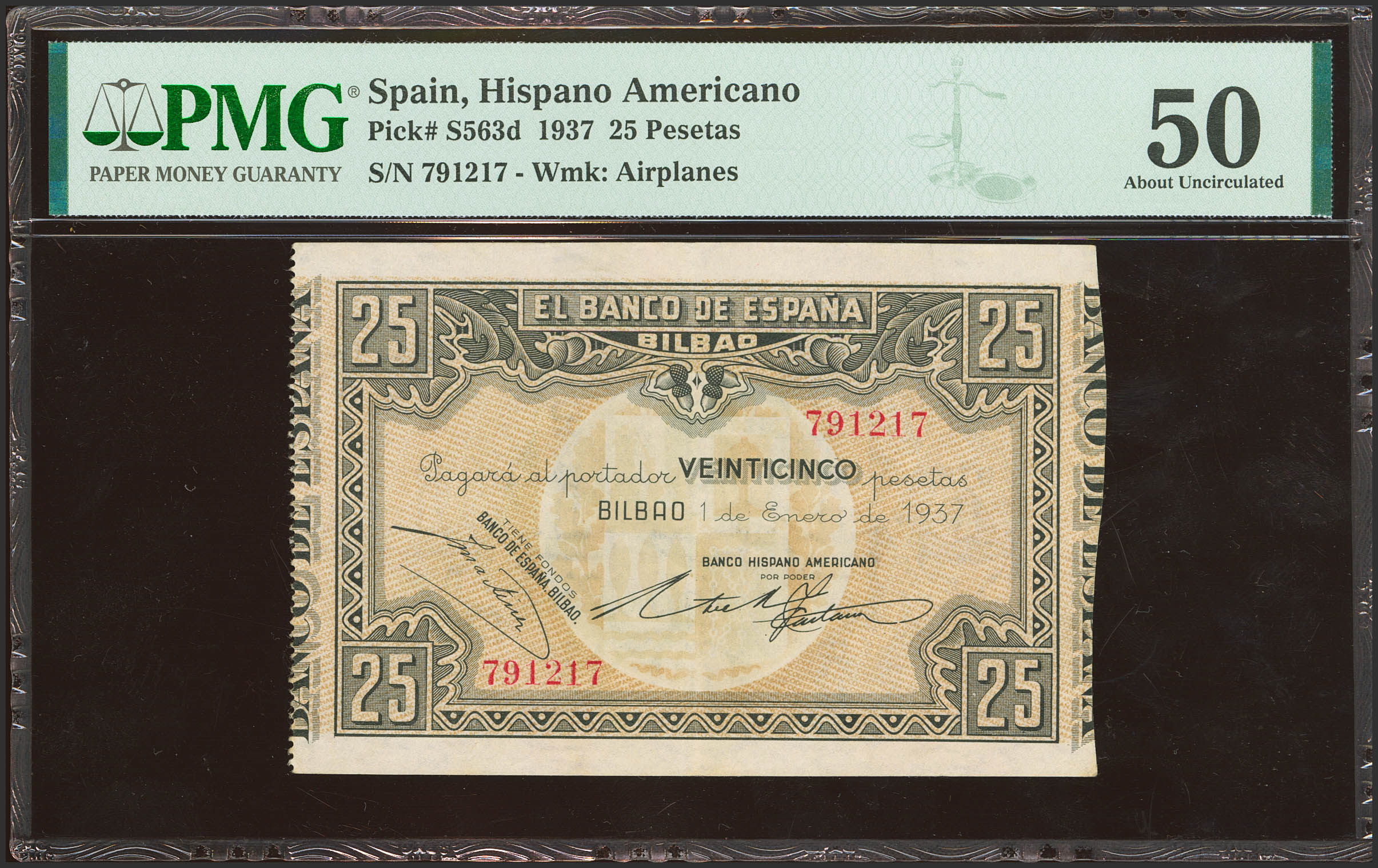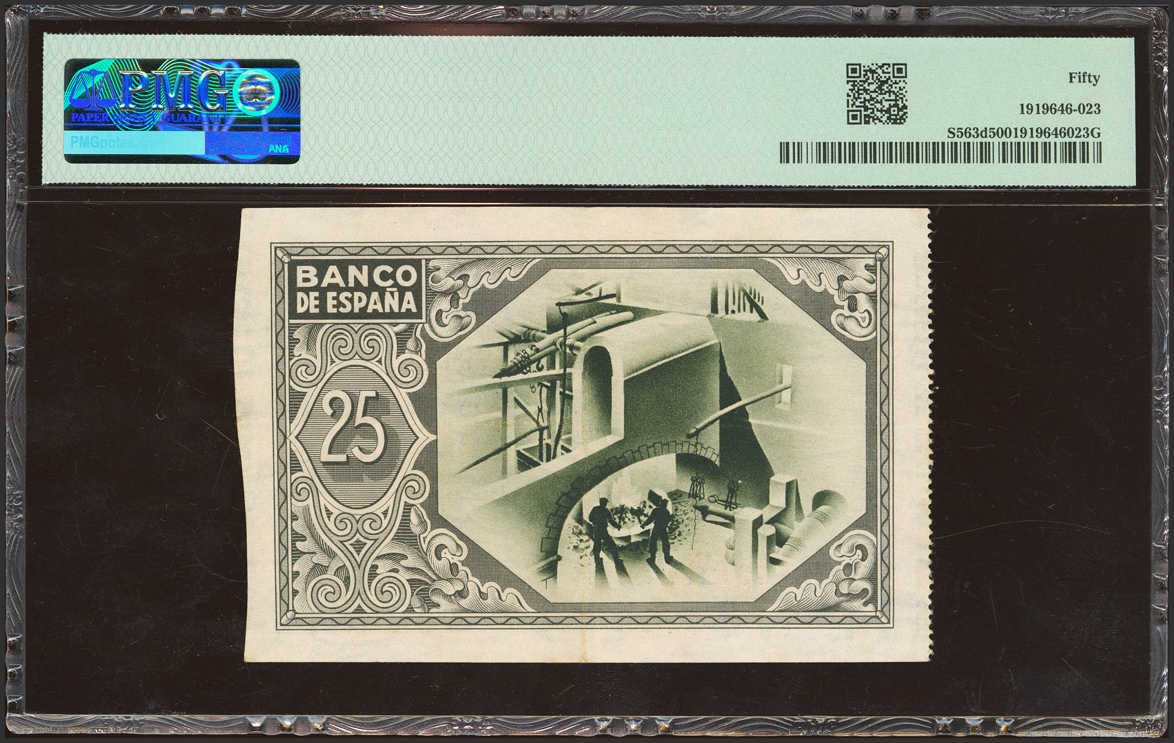 English 25 Pesetas. January 1, 1937. Bilbao branch, Banco Hispano Americano signature. Without series, with numbering and without matrices. (Edifil 2023: 388f, Pick: S563d). Extremely Fine. Encapsulated PMG50.