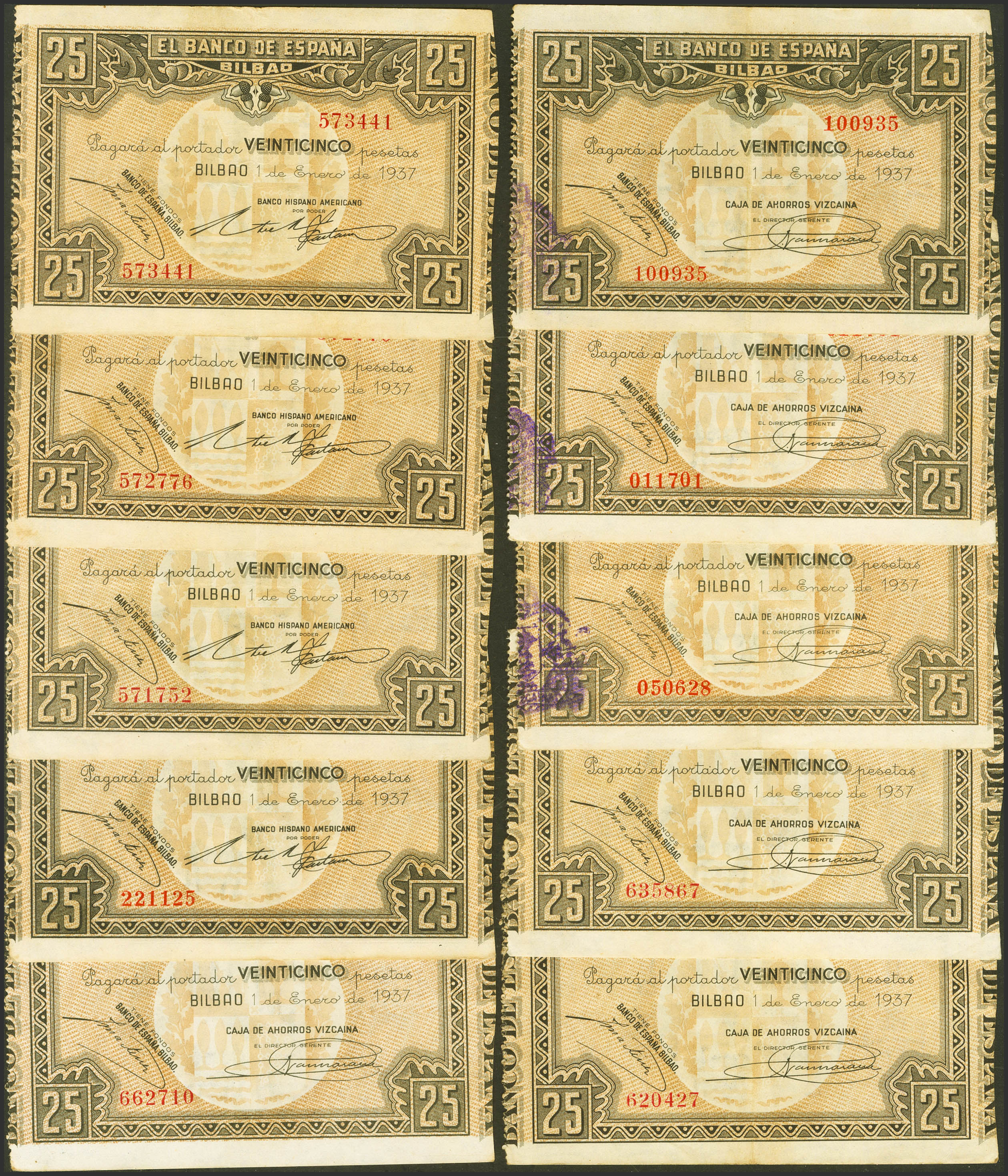 English Set of 10 25 Pesetas banknotes from Banco de Bilbao, issued on January 1, 1937, all of them without series and with various signatures. (Edifil 2023: 388). Extremely Fine/Extremely Fine-.