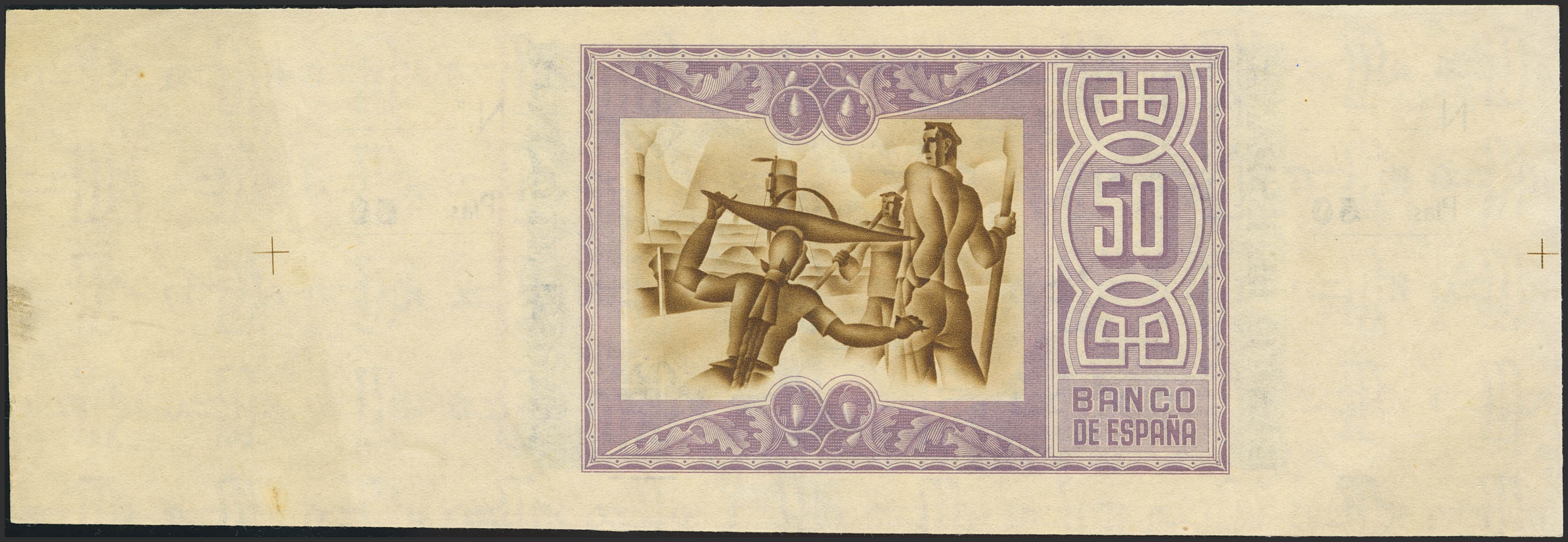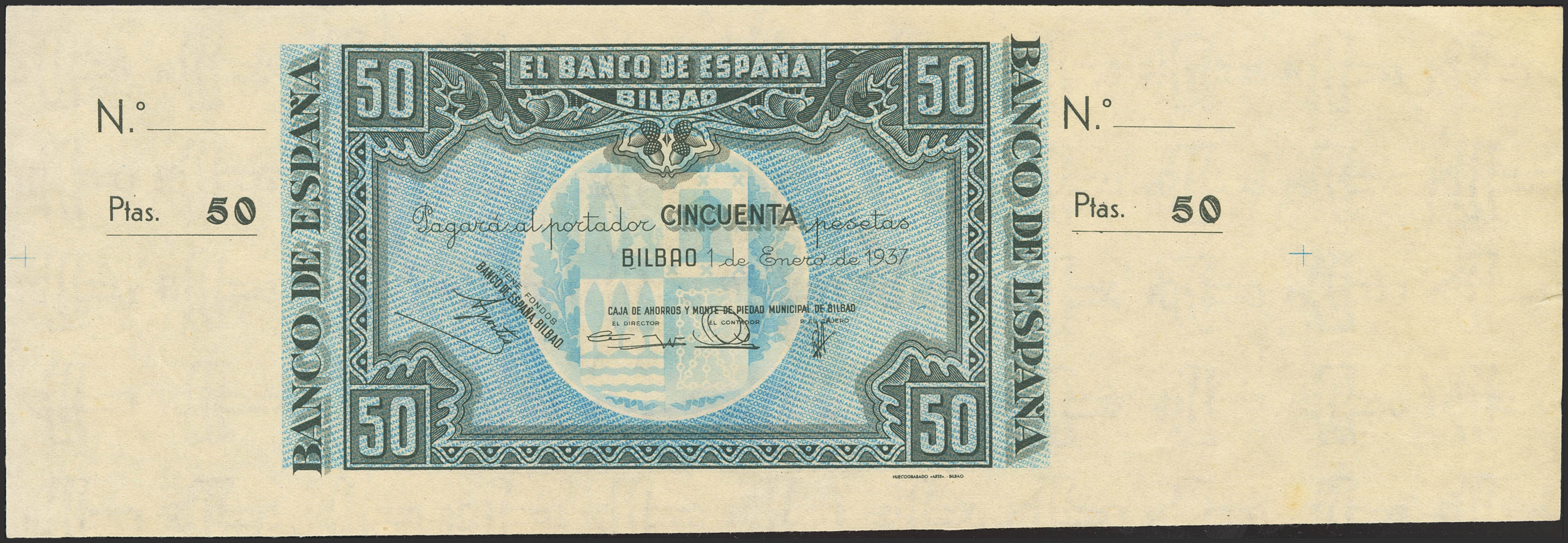 50 Pesetas. January 1, 1937. Bilbao branch, signed Caja de Ahorros y Monte de Piedad Municipal de Bilbao. Without series and without numbering, with both matrices. (Edifil 2023: 389c). Original marking. Good Extremely Fine++.